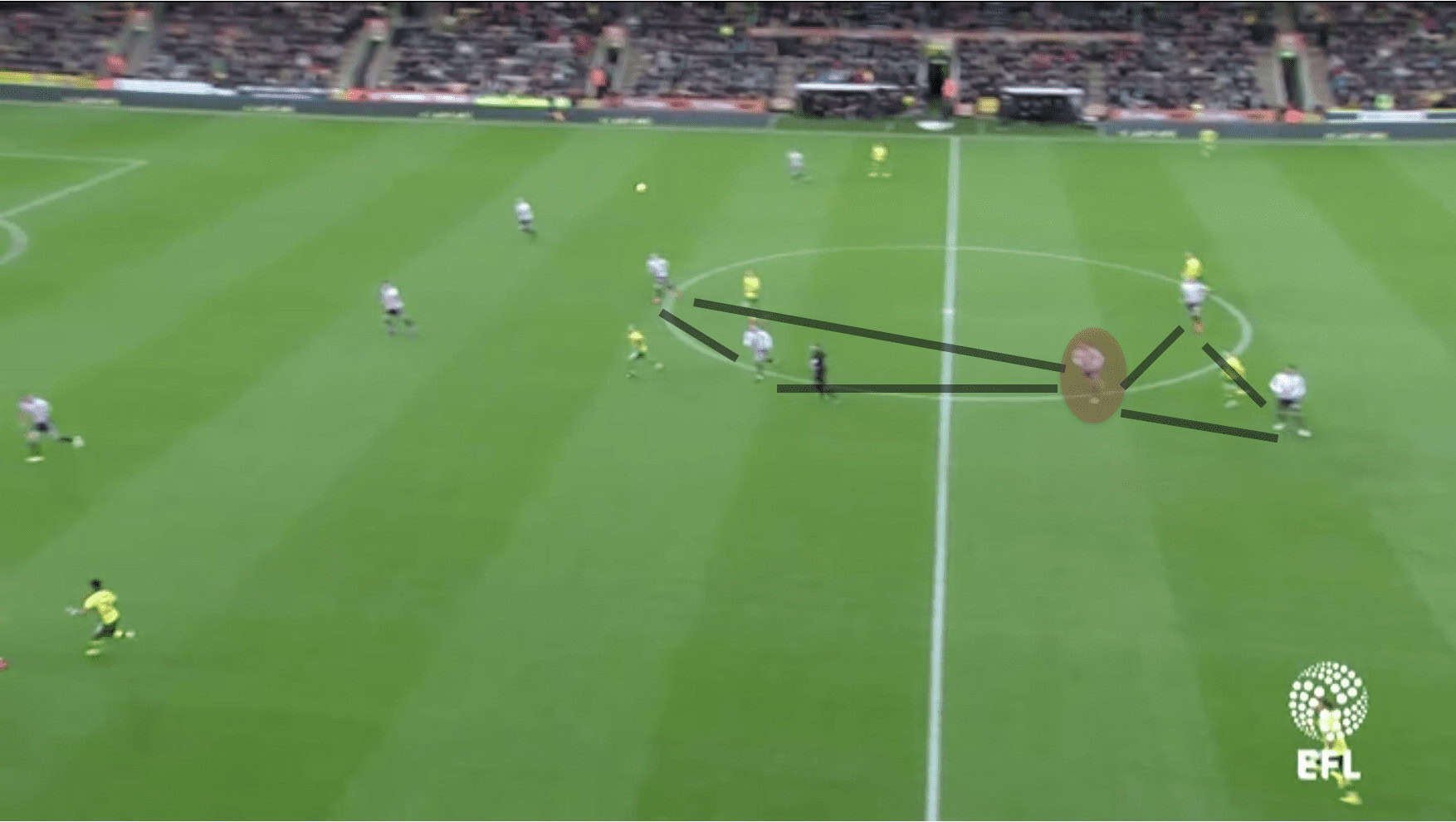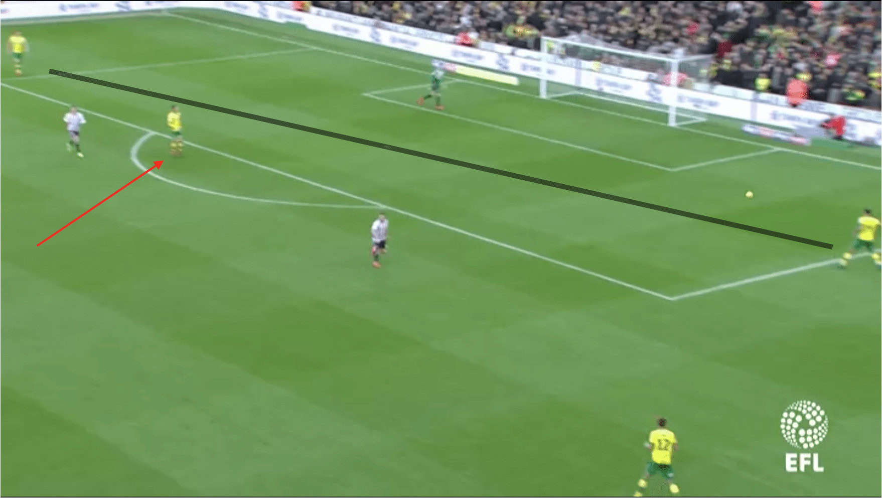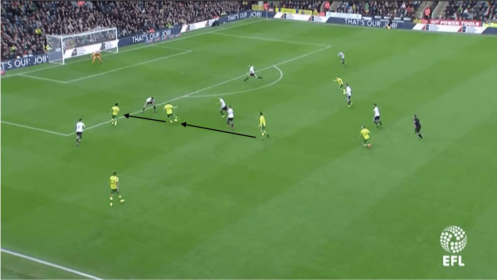 Their style was typified brilliantly by their opening goal, the strike from Onel Hernandez capping off a wonderful 14-pass move. The ball is gathered in midfield and moved back and forth across the pitch in a series of passes, which opens up space for Max Stiepermann. Norwich’s number 10 is then able to drive forward into a position where he can play a one-two with Hernandez, who has tucked in a little from the left wing.