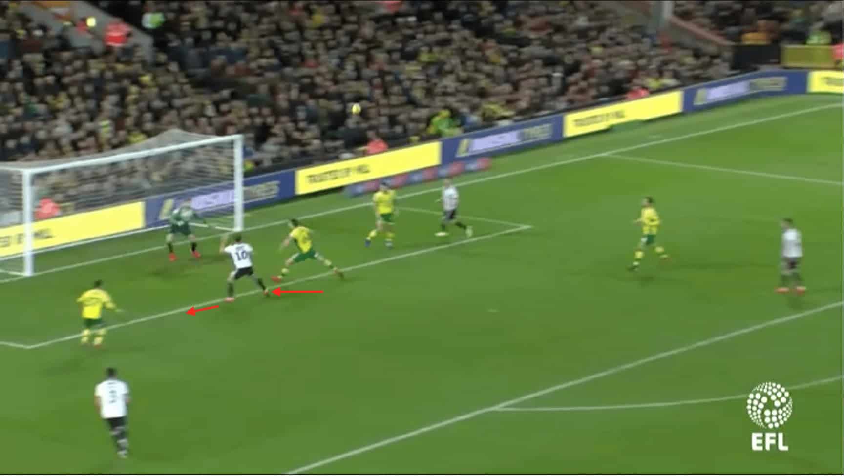 The ball is then worked quickly via Mario Vrancic to Teemu Pukki. The Finnish striker has been deadly in front of goal this season, but in this action operated as a false nine. He drops a little deeper to allow space for Hernandez to run into, then plays him through to score. It’s classic false nine movement brilliantly executed by Pukki and Hernandez.