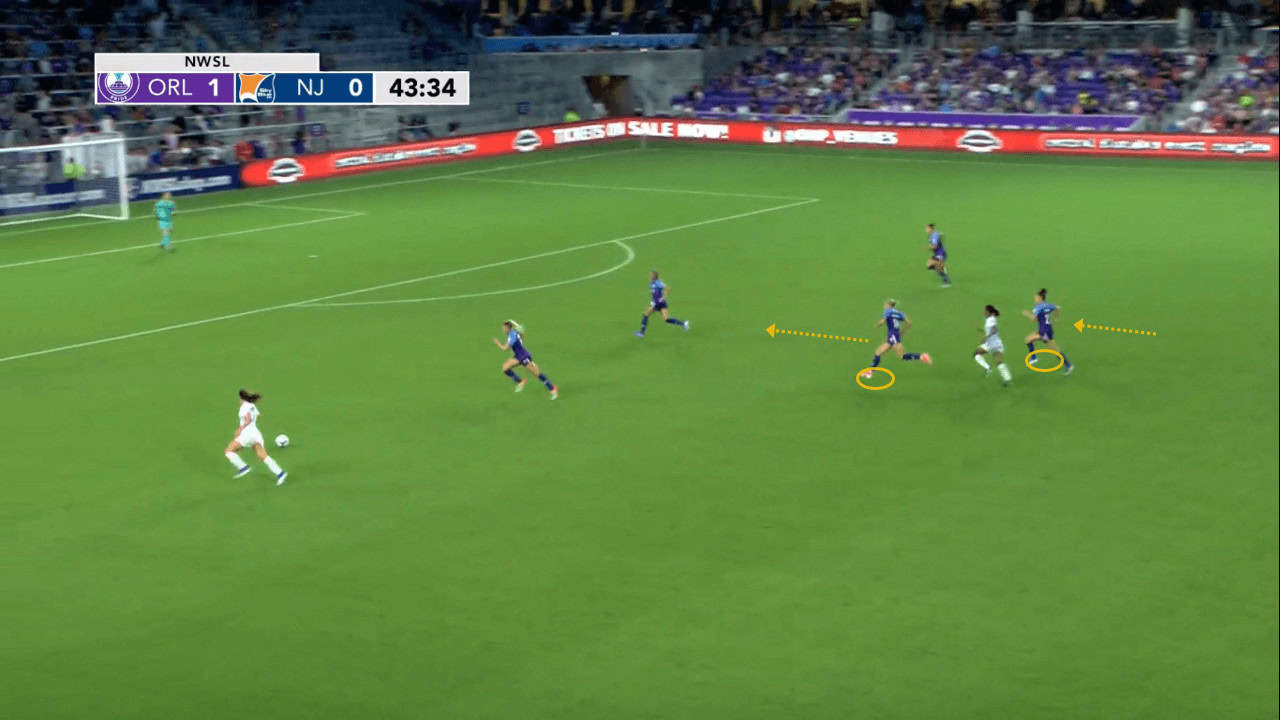 From the whistle, we saw a conviction about Orlando in their desire to win the ball back when lost. They engaged in a mid-block and gave a lot of freedom for the Sky Blue defenders to build from the back often sitting deep as a 4-4-2 with Marta and Viggiano up top. They only began to press a couple of meters before their half, but aggressively. The back four held their line zonally, as they left it to their central midfielders to engage in a man-oriented press. If Sky Blue would take longer in possession around the central areas of the pitch, the Orlando forwards, Chioma Ubogagu and Marisa Viggiano participate in double marking to win back possession.
