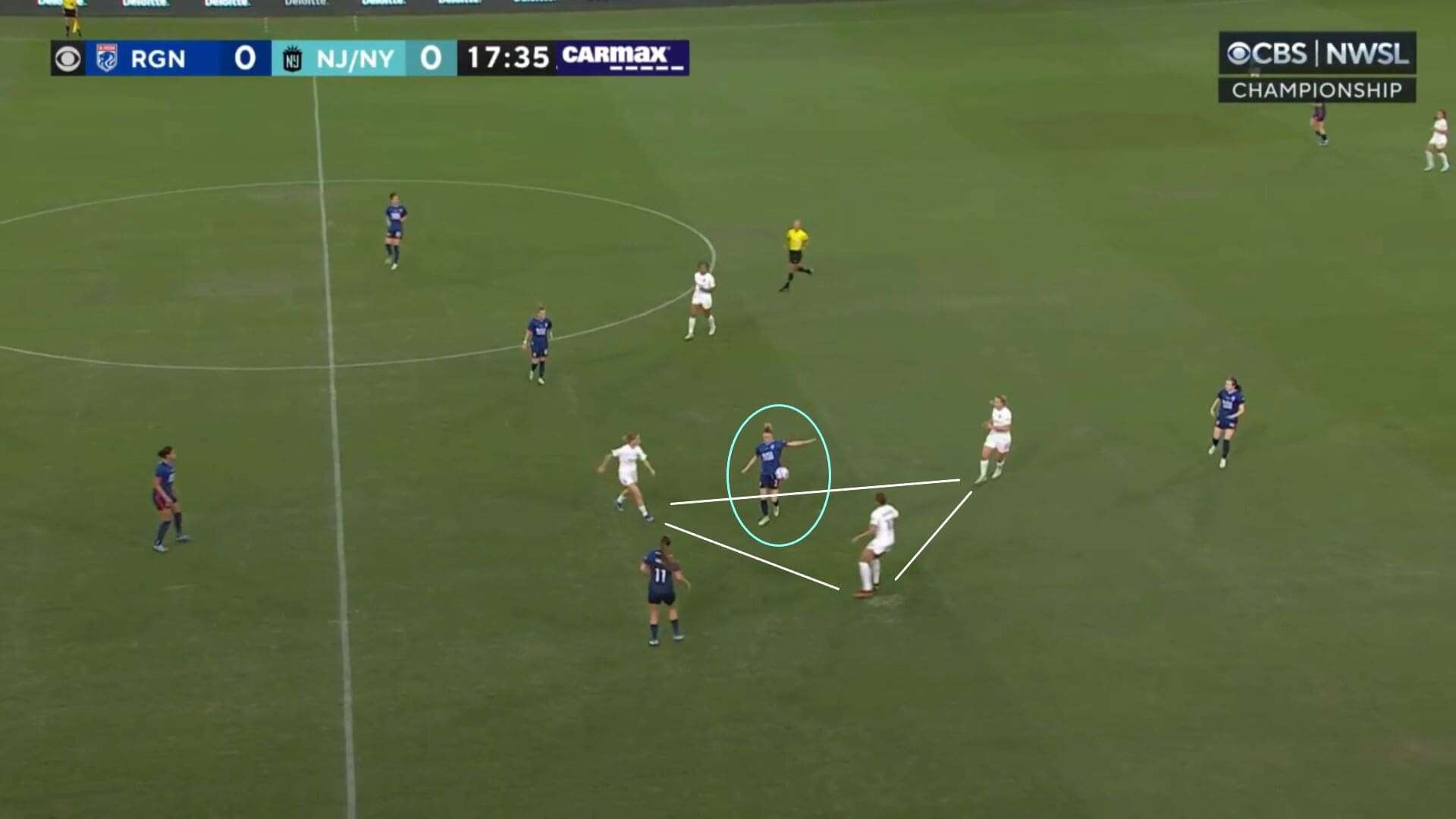 When dissecting NJ/NY Gotham’s game plan, several key concepts really helped them to get over the line, and it was clear that they had worked in the week on playing a certain way in order to take early control of the match and to put their opponents under pressure from the first whistle. The first of those that needs to be examined is their desire to control the central third, knowing that doing so would take a significant number of OL’s critical names out of action.