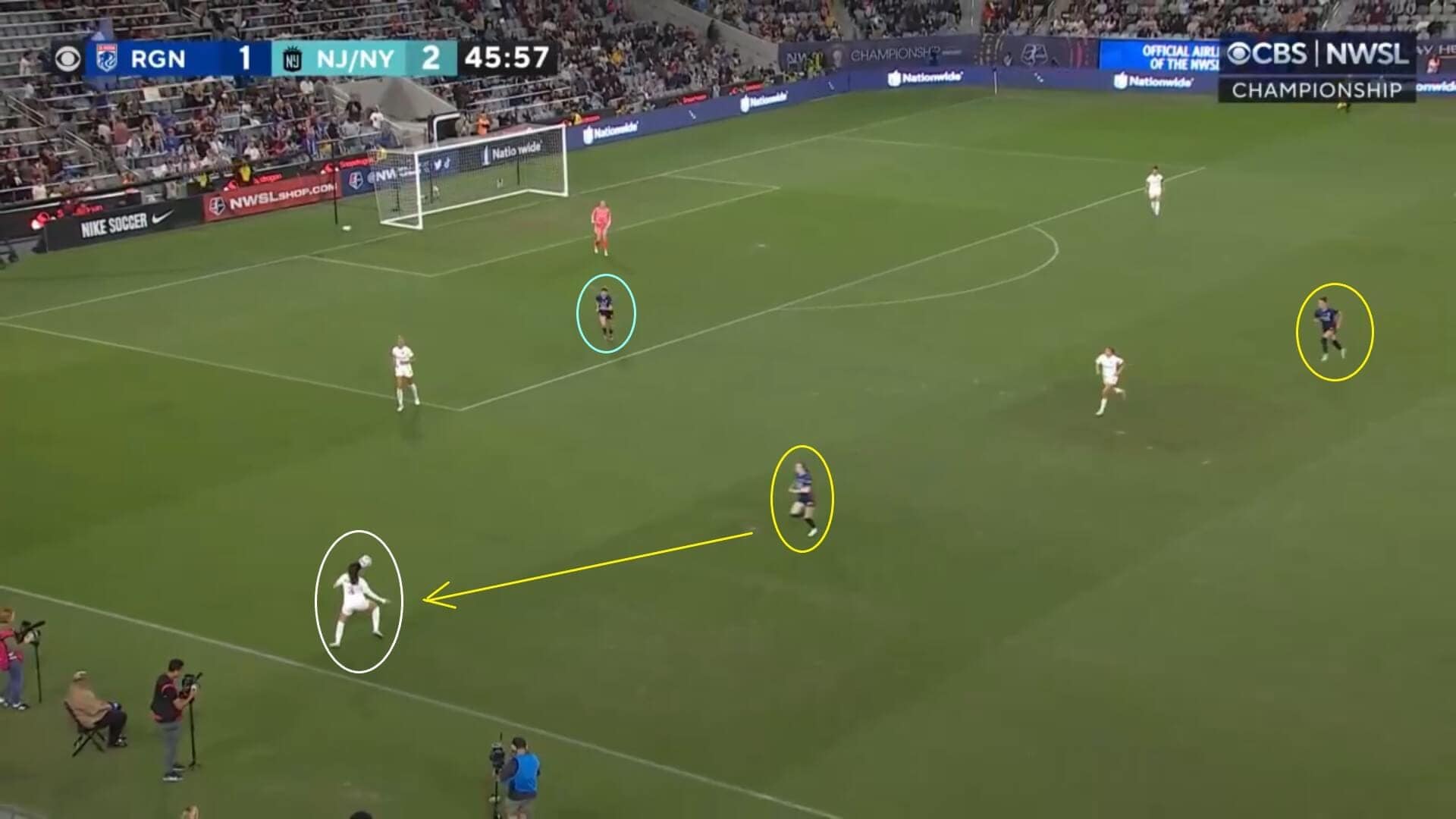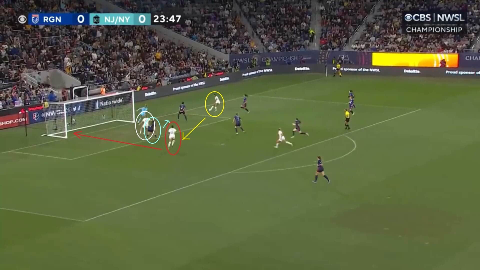 There were plenty of attempts by the Reign to unlock those areas of the pitch, but they rarely led to anything due to Gotham’s ability to get underneath the ball and win it before it could land at the feet of an attacker. This was because, with the ball hanging in the air whilst in transit, the Gotham defenders, in particular the central defensive partnership of López and Ali Krieger (the latter of whom was also playing her final match before retirement), had plenty of time to get into the right position and to thwart their opponents’ attempts to breach their line constantly.