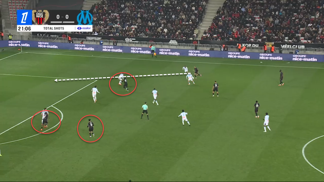 Furthermore, switching the wingers to different sides created confusion within OGC Nice’s defence, which helped to score the second goal.