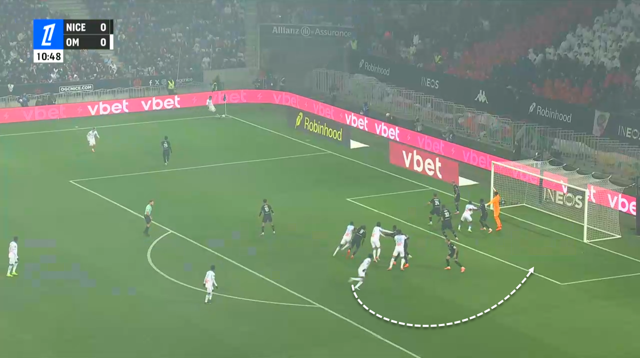 Aubameyang’s agility and speed made the difference during this corner-kick as the OM’s striker confused his marker thanks to his movement without the ball at the moment of executing the corner-kick.