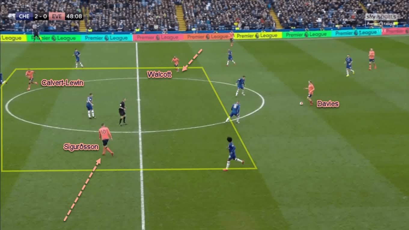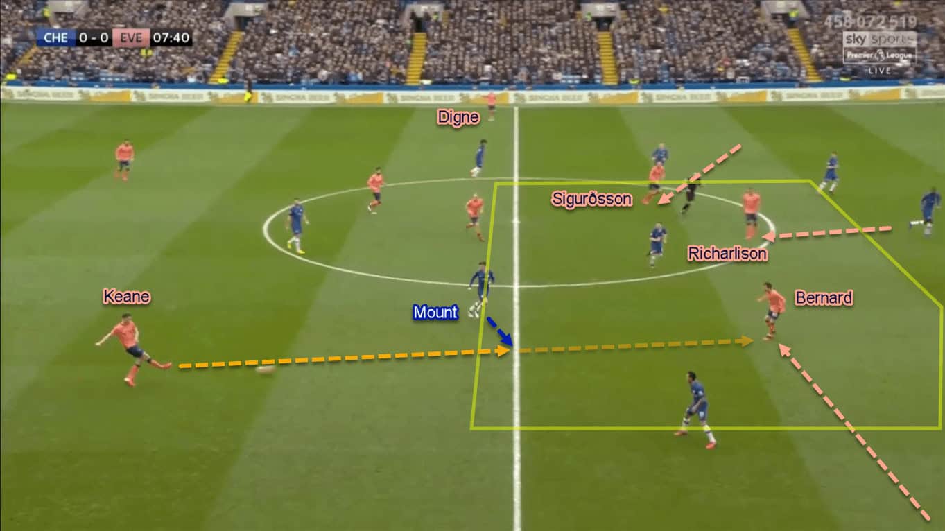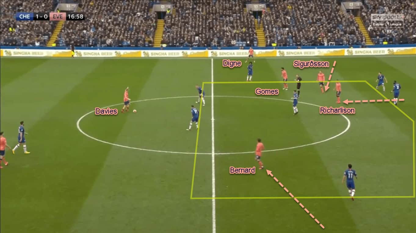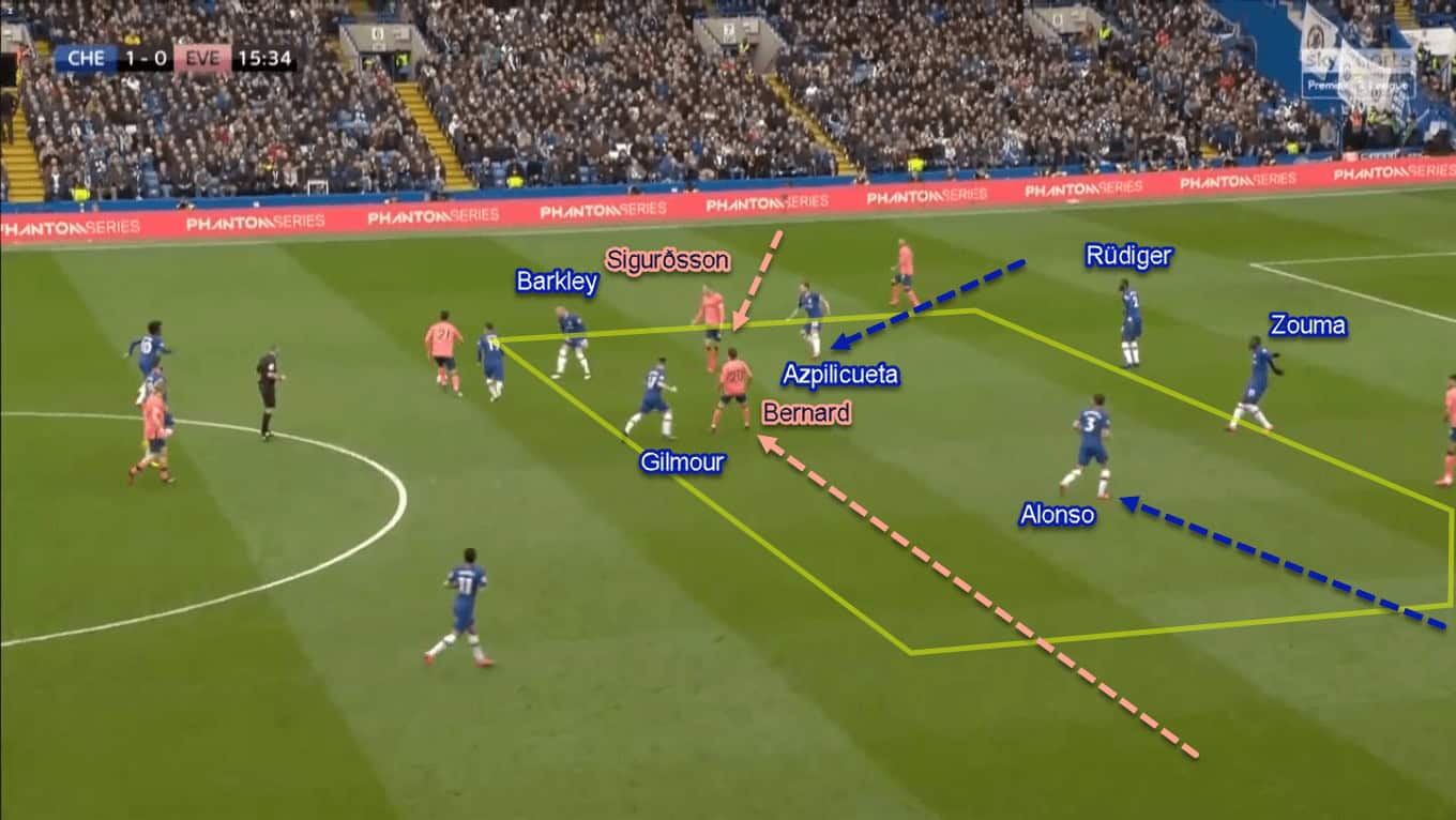 Mainly, he would ask his full-backs to step forward and follow their respective Everton wingers. By doing so, Chelsea would have additional bodies to help Gilmour in between the lines. In the process, both César Azpilicueta and Marcos Alonso would press their men aggressively. The objective was to prevent their opponent from receiving the ball comfortably in the dangerous area.