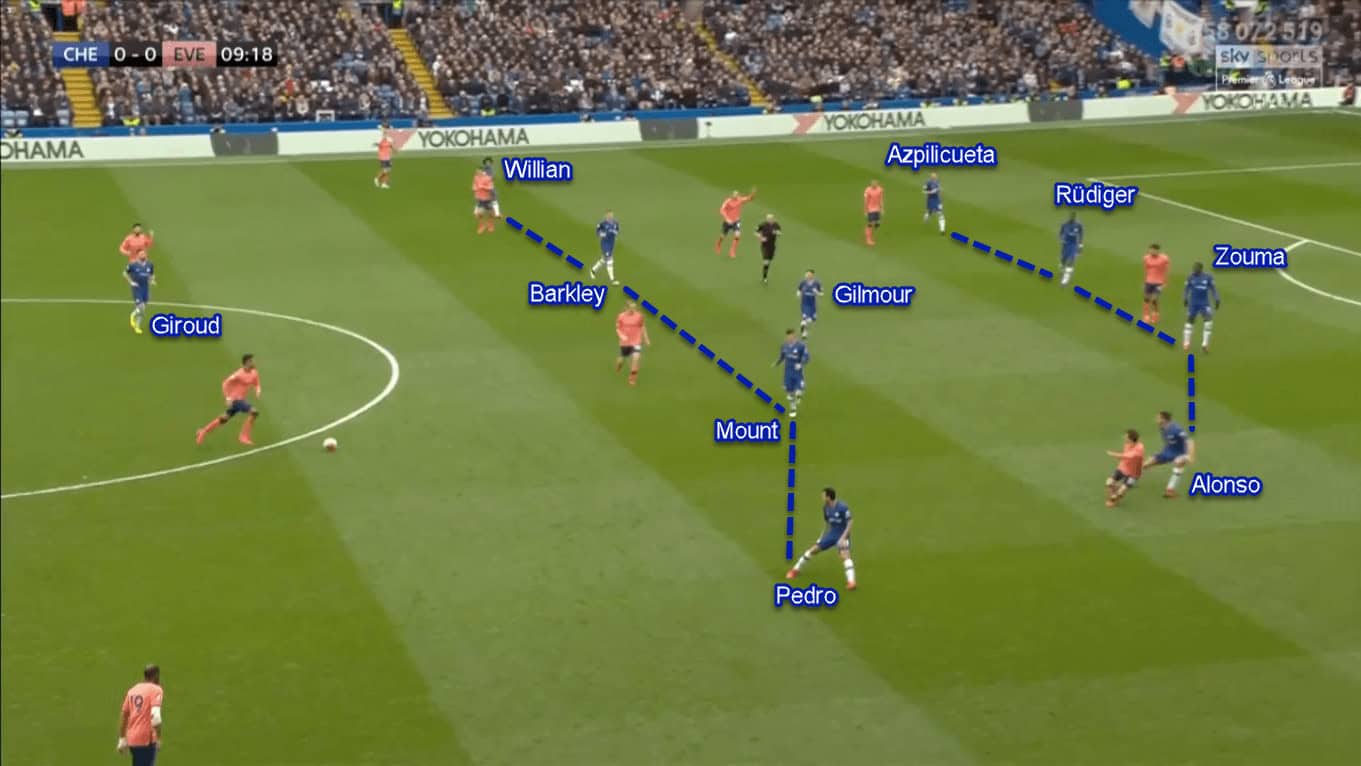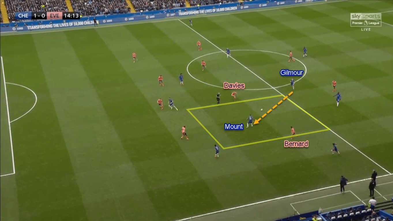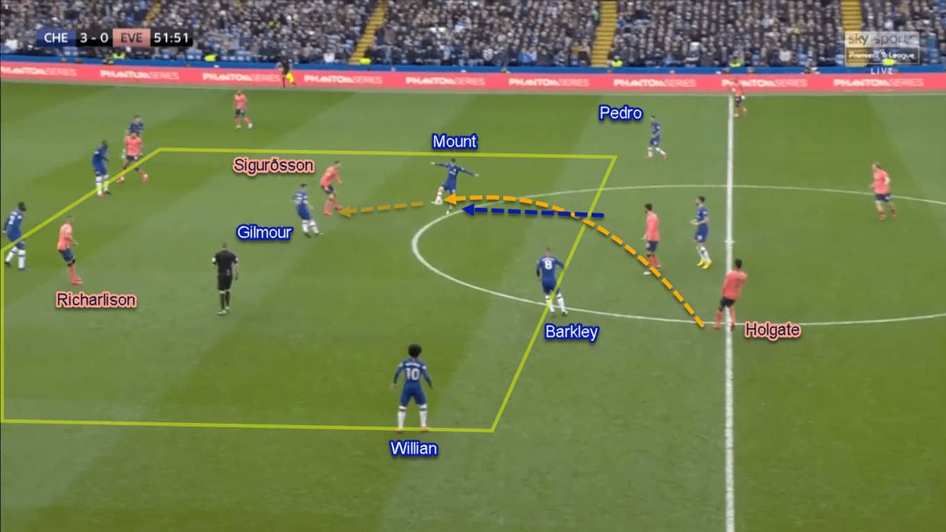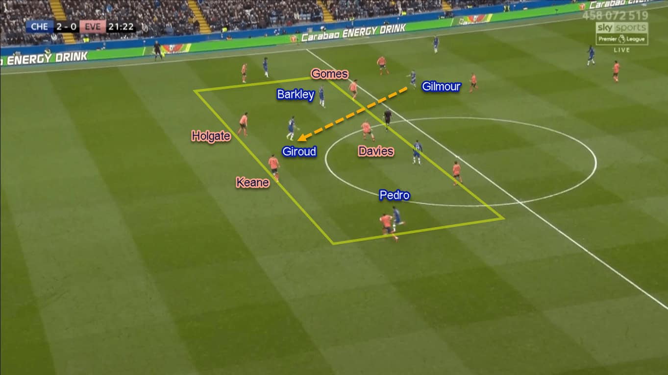When having the ball, Chelsea tended to build their attacks through Gilmour. No wonder that the 18-year-old ended the game with 76 passes; most in the match. In possession, Gilmour positioned himself in between Everton’s attacking and midfield line. Due to the visitors’ lack of compactness — which will be explained later — Gilmour had ample time and space to distribute the ball.