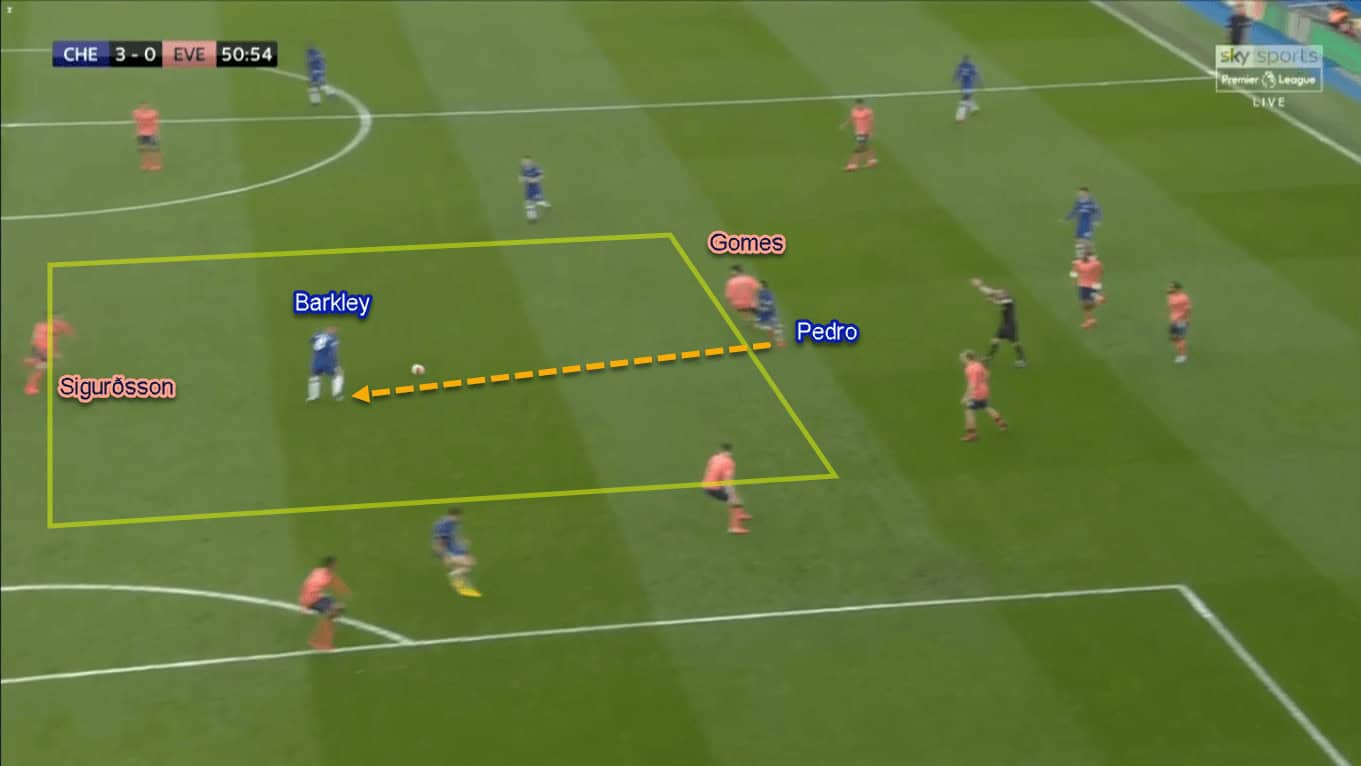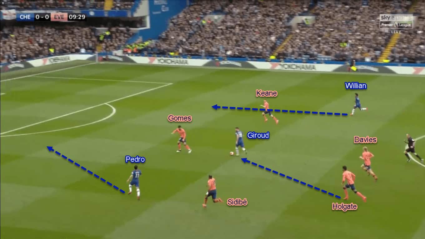 In their counter-attacks, Chelsea would try to exploit the area left by Everton’s overlapping full-backs. Both Willian and Pedro were tasked to make darting runs in behind with their trailblazing pace. Giroud’s presence in the central lane would pin Everton’s centre-backs; which helped Chelsea’s wingers to be free in the half-spaces. For a fact, Pedro’s goal resulted from an offensive transition.