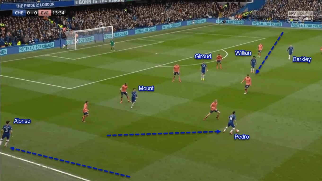 Initially, Chelsea used a direct approach to their attacks. They did that whenever Everton tried to press rather aggressively. In their direct approach, Chelsea utilised Giroud’s physical prowess to win the aerial balls. Looking at the stats, the Frenchman made ten aerial duels and won five (50%) of them.