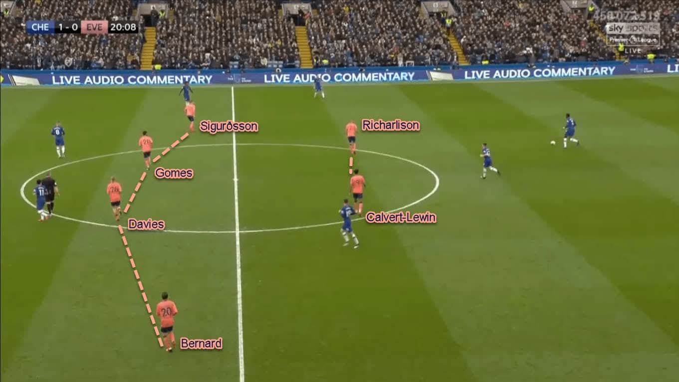 Defensively, Everton used their regular mid-block 4–4–2. However, it was not as compact as expected. Vertically, it allowed space in the areas between the lines. As mentioned before, Gilmour enjoyed the first area in Chelsea’s build-ups. The 18-year-old would often attract the attention of Gomes and/or Davies when he had the ball. This would further allow Chelsea a bigger advantage.