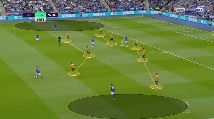 As the Wolves defence retracted, they formed a line of five players that left that line too far from their offensive players, reducing their offensive strength. This defensive positioning made it harder for Leicester to penetrate through the middle, as Wolves had their three defenders and the three midfielders covering the middle lane of attack, as shown below.