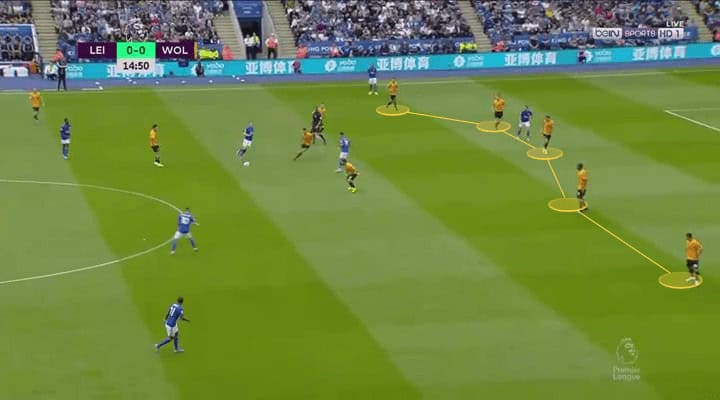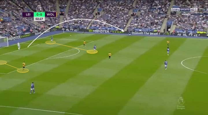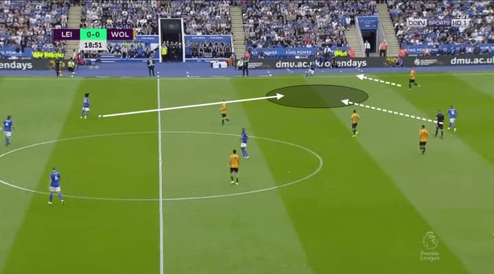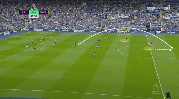 Back from the dressing room, the game restarts with Wolves taking advantage of counter-attacking. During the first ten minutes, they had three clear goal chances coming from counter-attacks and one disallowed goal by the VAR. As they gave possession to Leicester, when recovering the ball, they had both Raul Jimenez and Jota making runs forward looking for through passes coming from the midfield, such as the situation seen below.