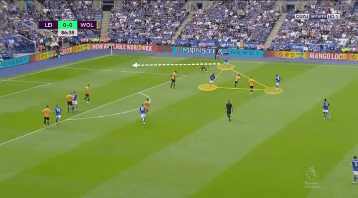 Initially during the second half, although Leicester kept possession, they again struggled to create danger. They took the ball to the last third of the pitch and started passing the ball around without being able to penetrate Wolves defence. They didn’t produce any coordinated movement to lose their markers, no change of rhythm or any creative passing to be able to break the defensive cohesiveness of Wolves. Not until Rodgers decided the first substitution, replacing Choudhury by Barnes. The latter positioned himself wider and Leicester started to use the wings more efficiently. He pulled Wolves players wider and gave more space to Maddison to be able to move forward with possession, instead of receiving facing backwards.