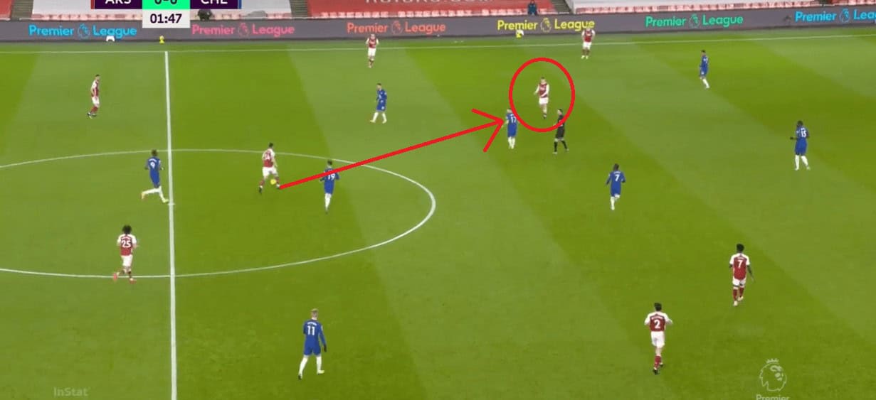 With the changes that Arteta made, Arsenal had players who can occupy pockets of spaces in the midfield and in between the lines. This non-occupational of spaces and a lack of a presence in between the lines were the constant issues that Arteta and Arsenal had. Smith-Rowe is one such player as he reminisces Aaron Ramsey in noting these tiny spaces and making runs into that. In the example, we can see Smith-Rowe in between the lines and Xhaka has a clear passing lane to him. Smith-Rowe kept occupying these half-spaces throughout the match and Chelsea faced difficulties marking him.
