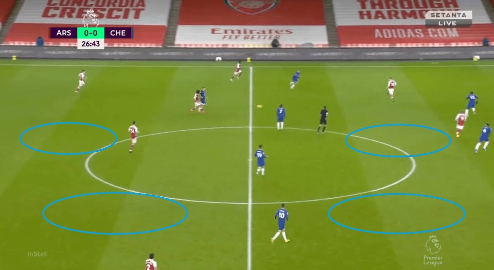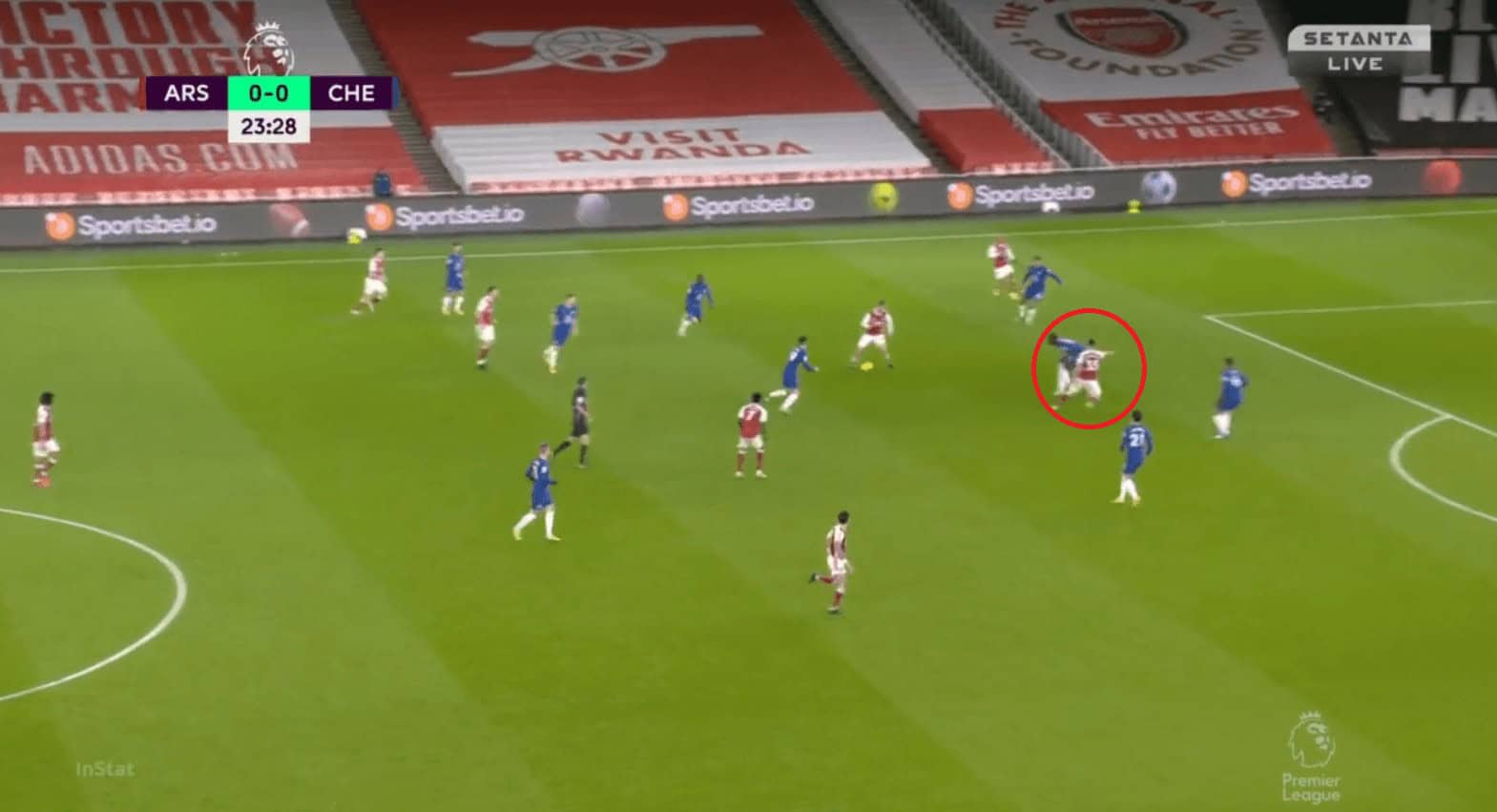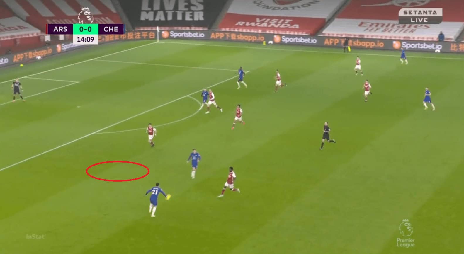 Another issue with Chelsea’s positional play was they were not proactive in occupying spaces and also few times they had very fewer men on the ball near flank and left many men on the opposite flank. This made it easier for Arsenal to defend and as they needed fewer men to commit. In the example, we can see Chilwell having the ball and most of the Chelsea players are on the opposite flank. Abraham is closer to the right half-space when he is supposed to be occupying the space in the left one (red circle).