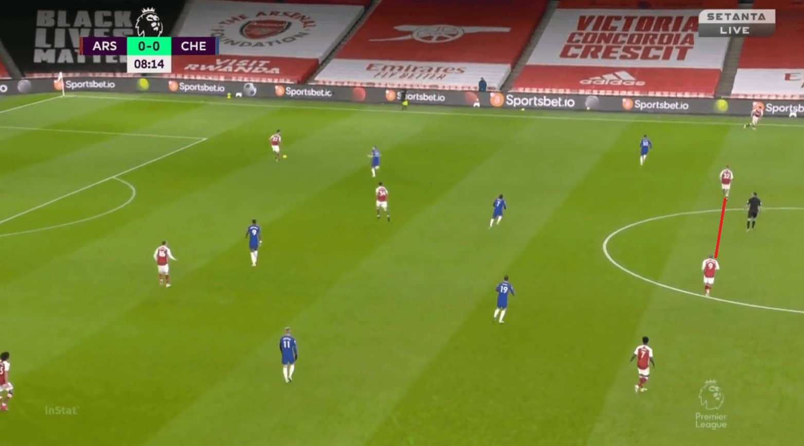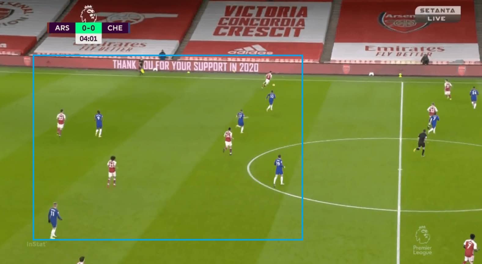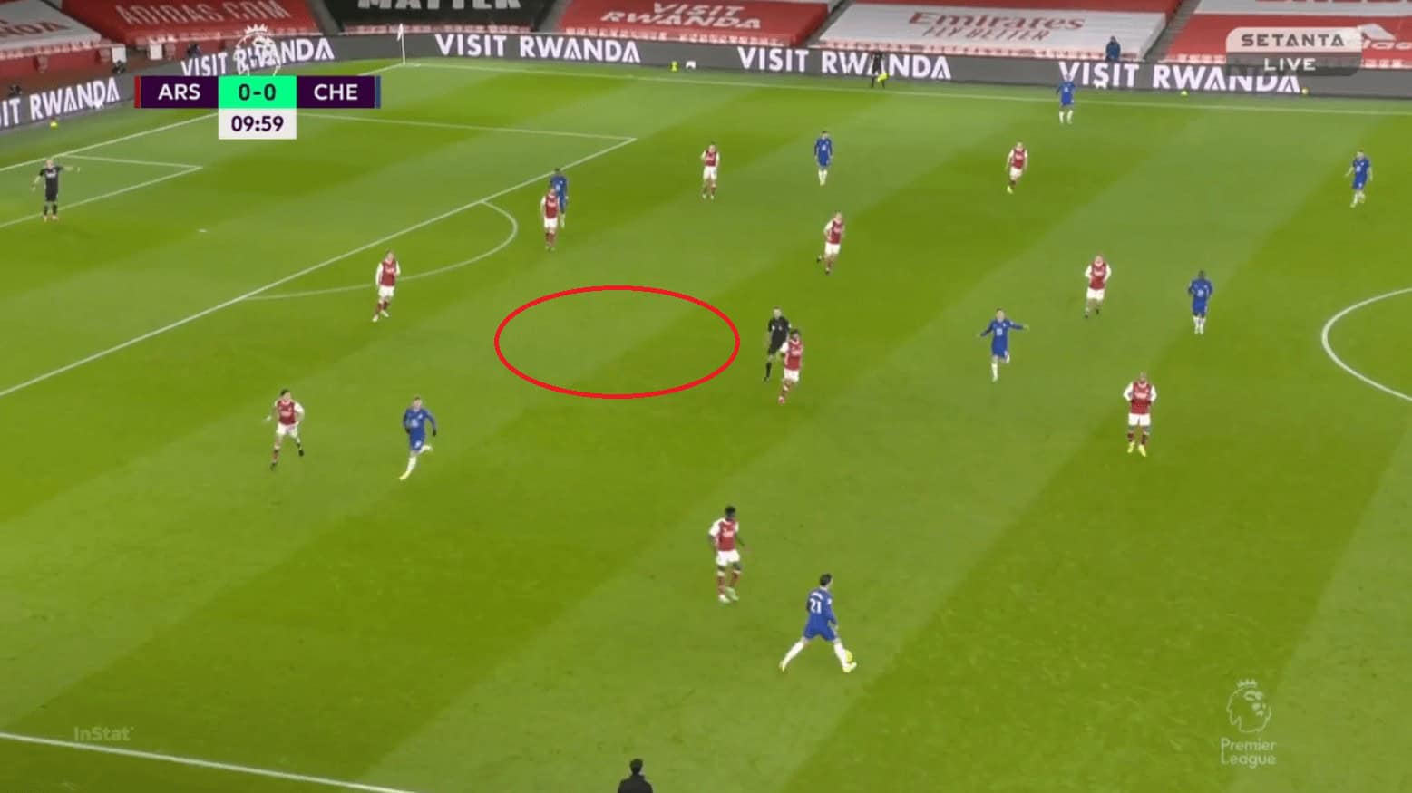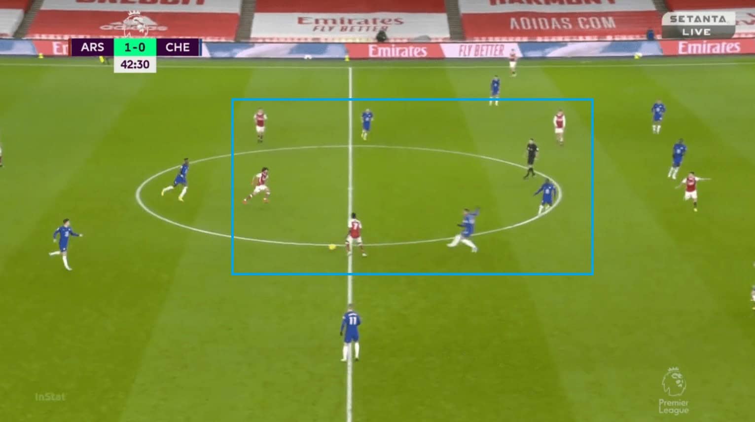 Another issue with Chelsea’s positional play was they were not proactive in occupying spaces and also few times they had very fewer men on the ball near flank and left many men on the opposite flank. This made it easier for Arsenal to defend and as they needed fewer men to commit. In the example, we can see Chilwell having the ball and most of the Chelsea players are on the opposite flank. Abraham is closer to the right half-space when he is supposed to be occupying the space in the left one (red circle).
