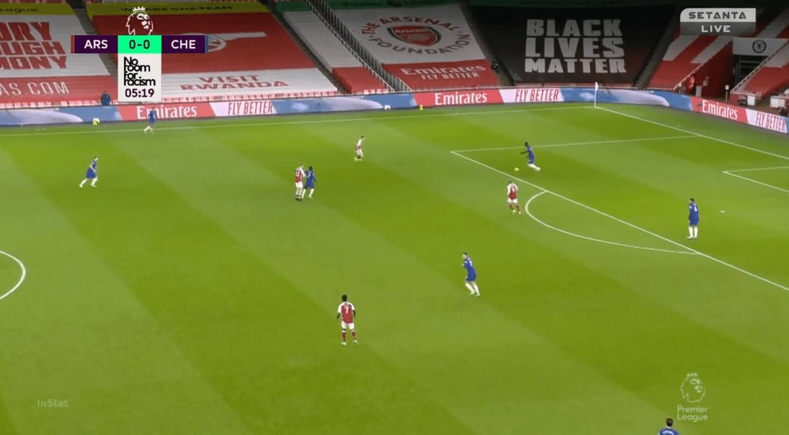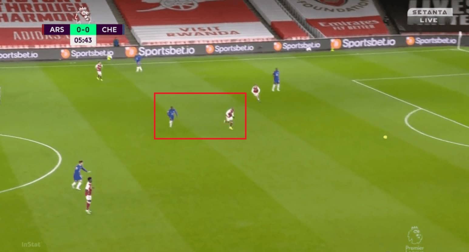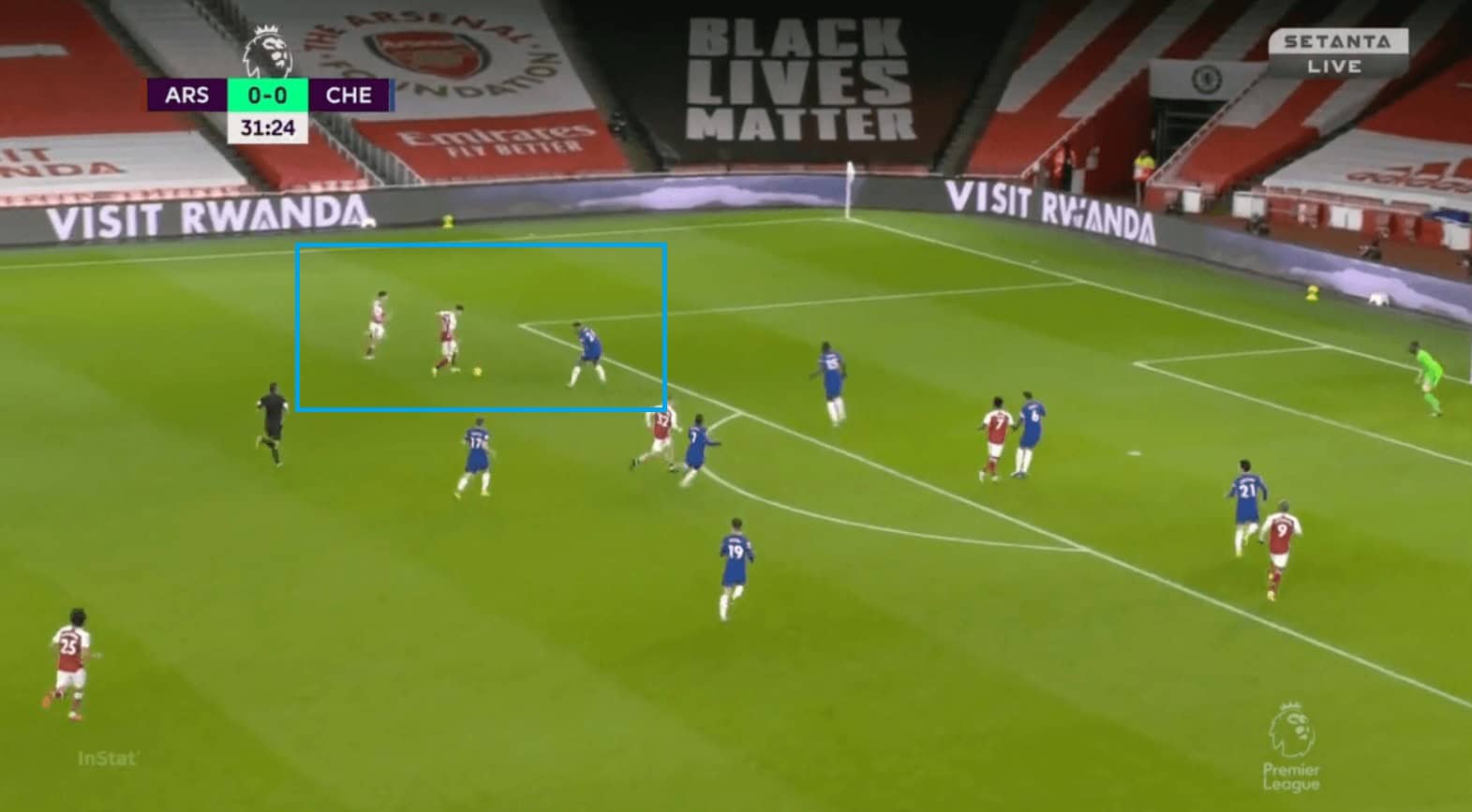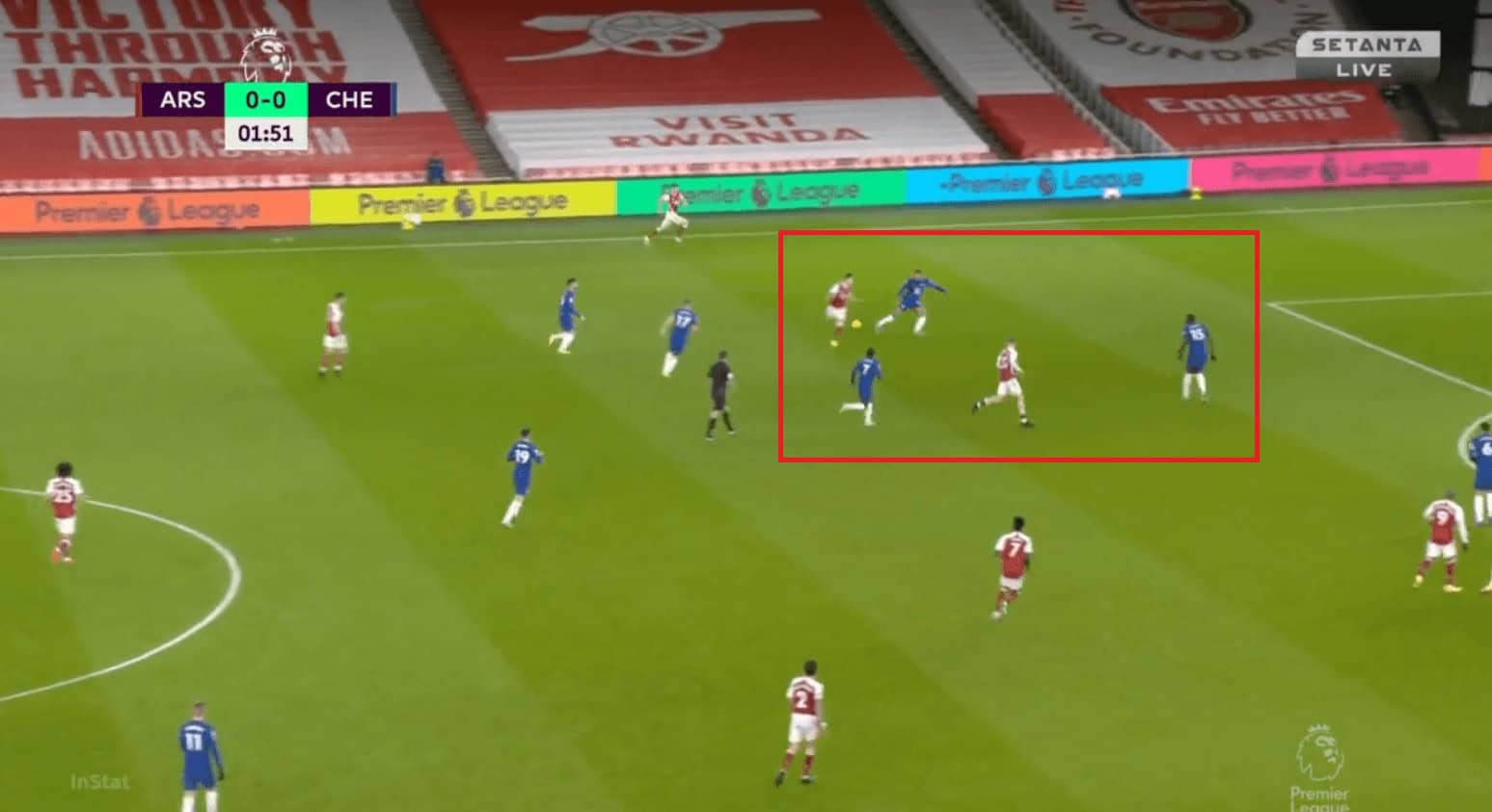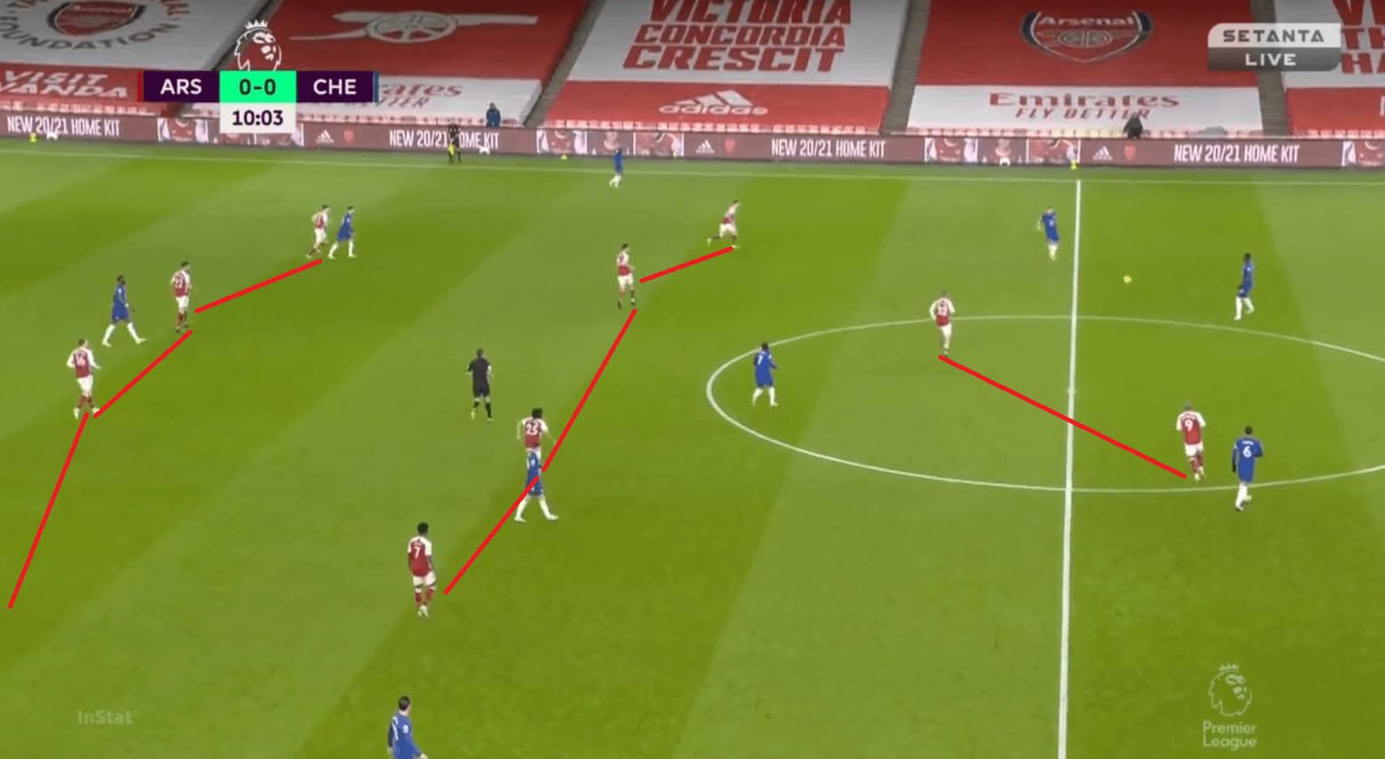 Arsenal defended in a 4-2-3-1 formation with a man-oriented zonal system both higher up the pitch and in the middle-third. Their first line of defence ensured that Chelsea did not progress the ball into the midfield by tightly marking Kante. When the ball went to Zouma, Smith-Rowe would press him while Lacazette marked Kante and when the ball went to Silva, the roles reversed.