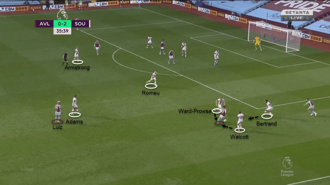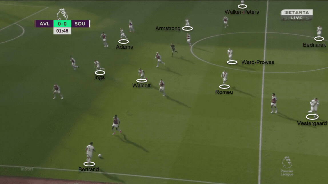 Aston Villa could barely progress the ball leading to an attack in the first half. When they managed to get the ball in the opposition’s half, Southampton overloaded the ball-side corridor and won the possession with numerical superiority. The midfield line especially worked hard to drift near the ball. Walcott and Armstrong were assisted by both Romeu and Ward-Prowse to deal with Villa’s attack.