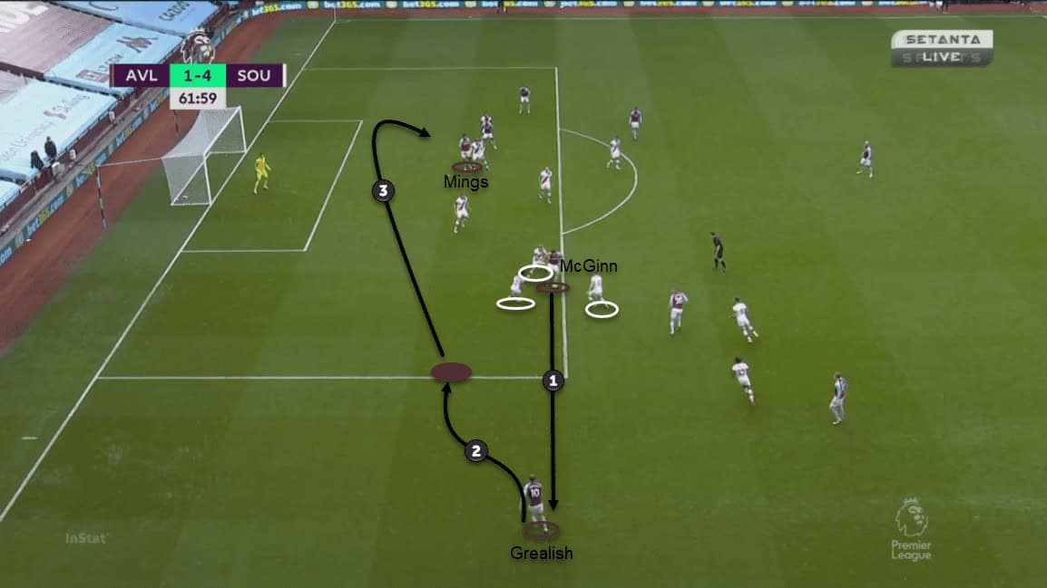Besides the crosses, Aston Villa’s quick ball circulation was crucial in the turnaround. The quick switch from Luiz to Grealish put Walker-Peters in a 2v1 situation against Grealish and Targett. The English winger could cut inside and catch McCarthy off guard to beat him at the near post from long range. However, the third goal came too late to give Villa hope for an equaliser.