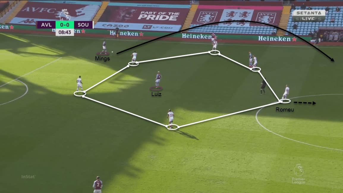 Martínez played maximum passes to Mings as he was tasked to launch the ball long. Mings played 14 long passes in the match with seven being accurate. The initial idea was to release Watkins down the channel but he was well watched by Southampton’s centre-back pair. Luiz was left open in the centre as a bait pass while McGinn and Barkley were monitored by Romeu and Ward-Prowse. They were well-coached to know when they had to break the shape and go back to help the back-line. As Ming’s attempted the long pass, Romeu and Ward-Prowse would rush back to win the second ball or pick up the loose balls to retain possession before McGinn and Barkley.