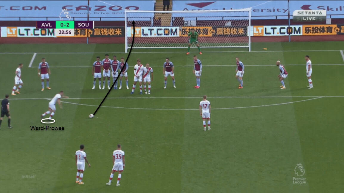 Aston Villa had Barkley on the duty for delivering set-pieces. He tried multiple variants to keep the Saints guessing. In the 23rd minute, Traoré disjoints from the huddle to run away from the goal. His blindside run helped him stay unmarked and Barkley played a ground ball to him. The shot went wide but it was a great utilisation of a left-footed player to get a reverse shot from the free-kick.