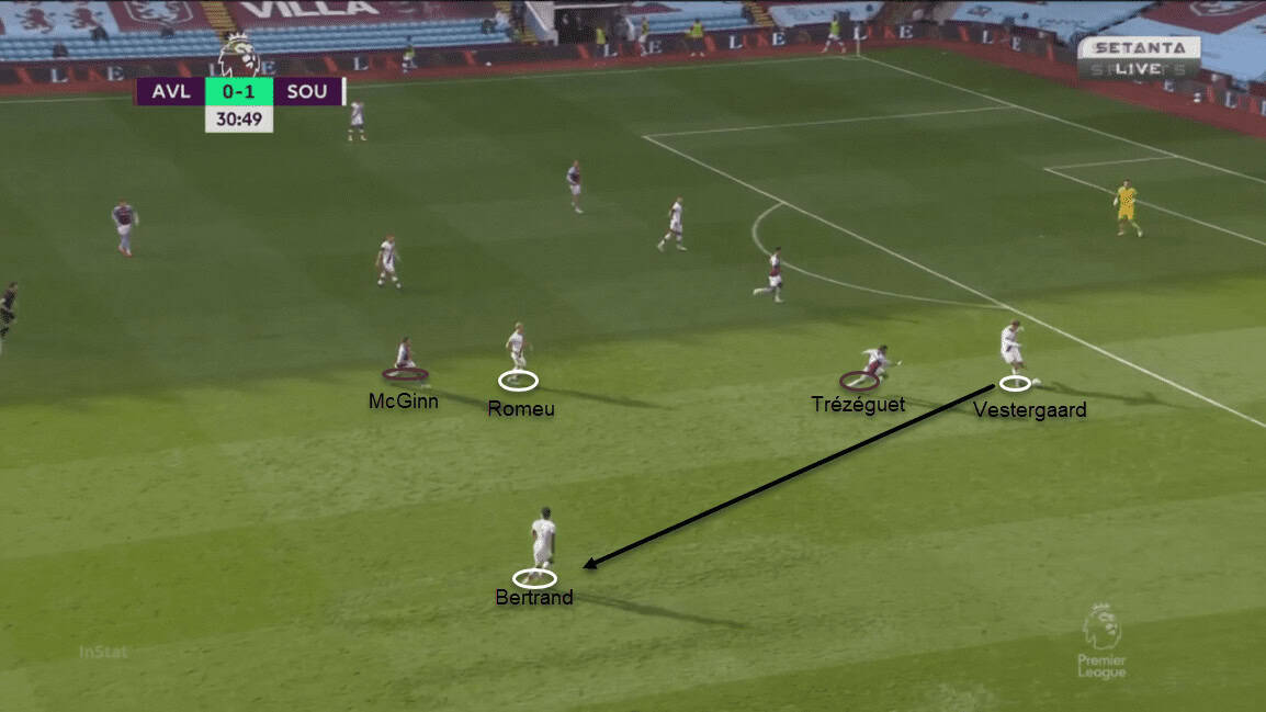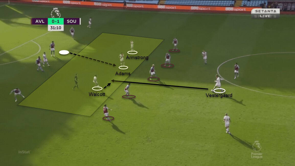 The Saints could progress the ball in the first two phases of build-up without much hindrance. Villa’s midfield and defence line left a huge hole between them for the inverted wingers to strategically sit it. Either Adams or Ings would also drop in while the other along with the full-backs held Aston Villa’s line deep. The wingers positioned themselves between the lines and in the passing channels to a passing outlet in the centre. With just one pass, Southampton was able to bypass the entire midfield of Aston Villa. Walcott was fouled after receiving a pass from Vestergaard through the channel. Ward-Prowse scored a goal from that free-kick. On another occasion, Adams received the ball between the lines and he turned to play it into Ings’ path. He chipped it over the goalkeeper but it was called offside.