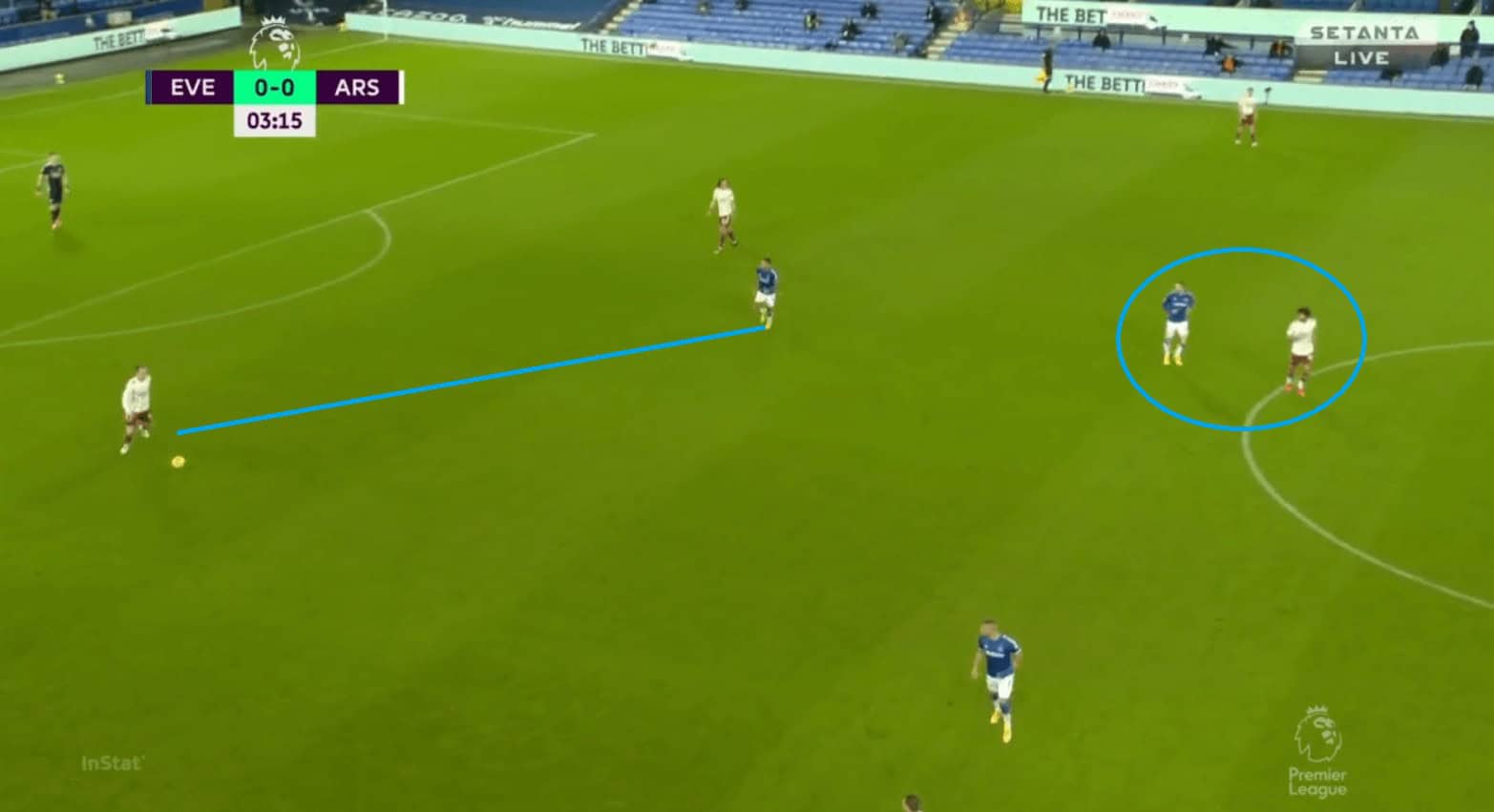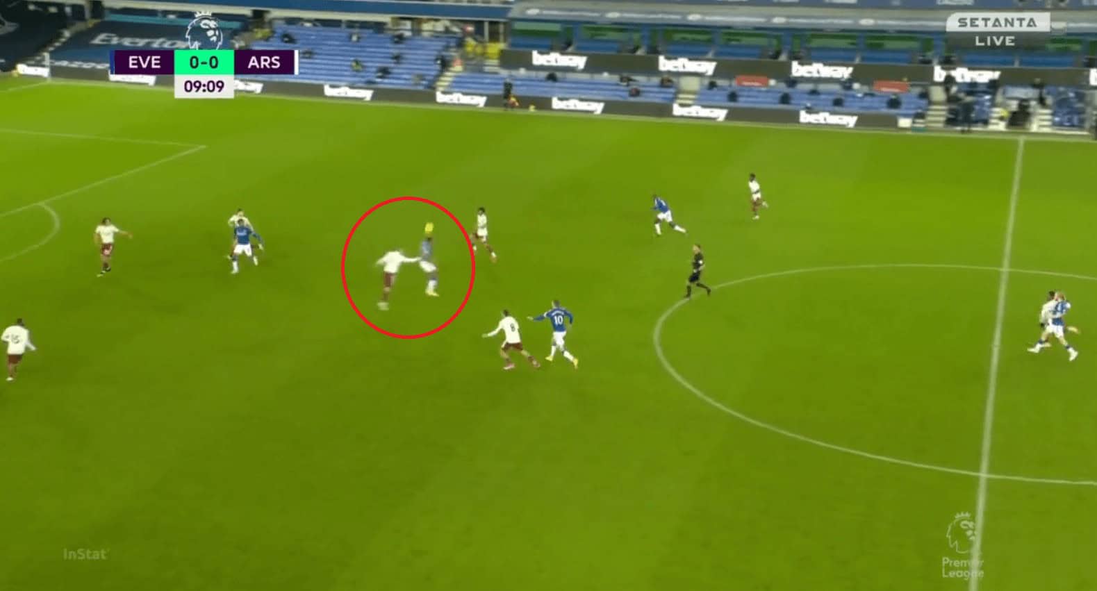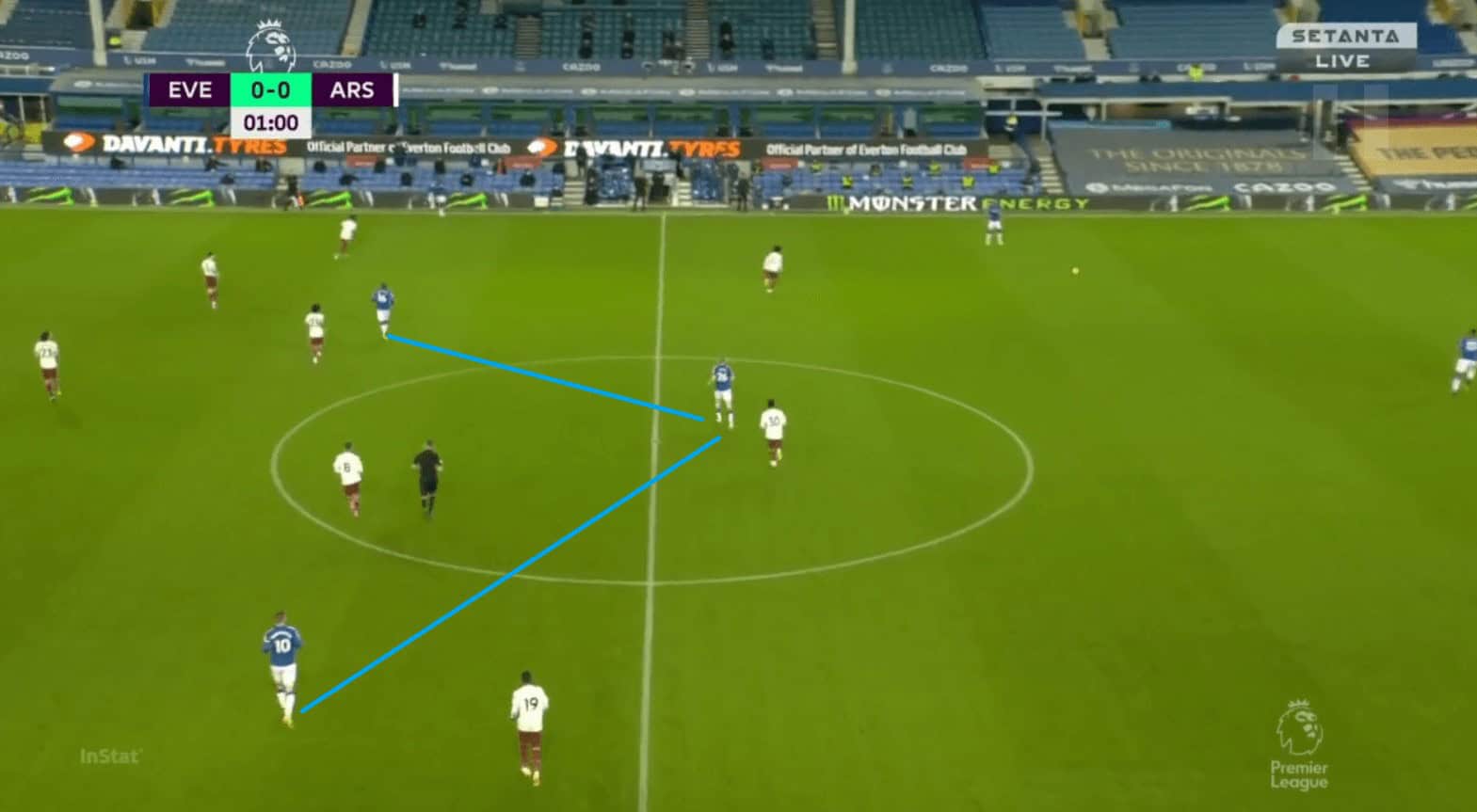 Like in their previous games Everton heavily relied on directness and were very successful against a very weak Arsenal defence in the air. They had a total of 5 shot attempts from set-pieces. Their talisman, Calvert-Lewin, won a game-high of 4 aerial duels. He was pretty unchallenged by the likes of Holding and Luiz in the air and even when Pickford had to send in a panic long ball due to pressure. Calvert-Lewin ensured that Everton regained their advantage by winning the first ball.