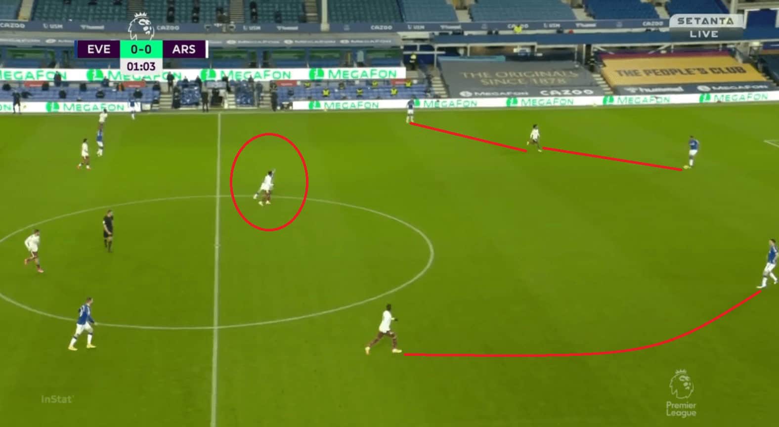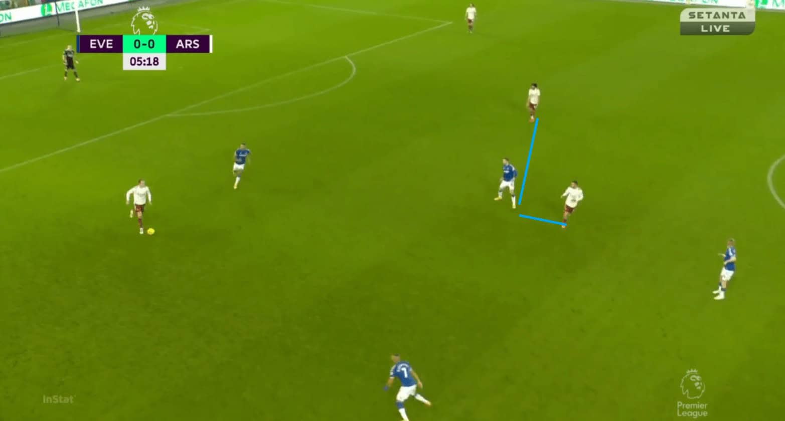 When the ball went back to Pickford, Arsenal closed down all the passing options to him that was short where he had no chance but to go long from where Arsenal tried to win a 50-50 duel with Calvert-Lewin. Arsenal’s closing down of players in the first 10-15 minutes were very good and Everton struggled in that phase to move the ball into the subsequent thirds.