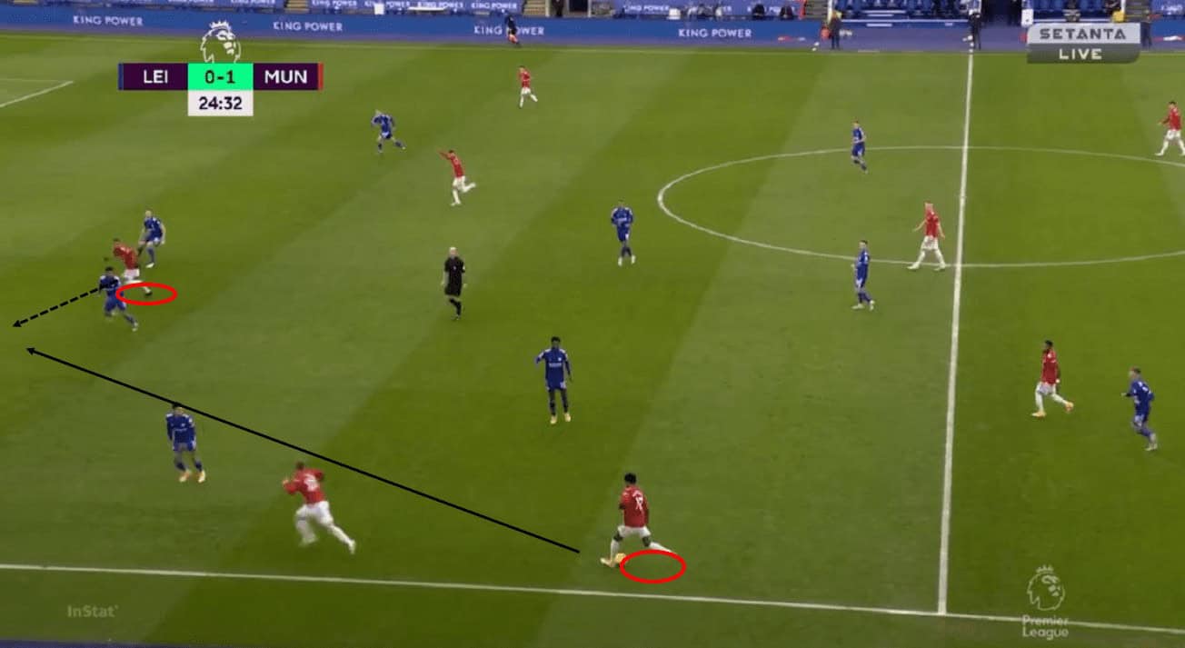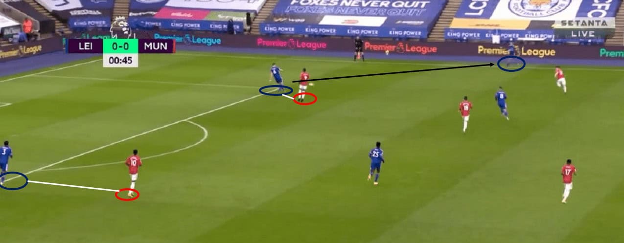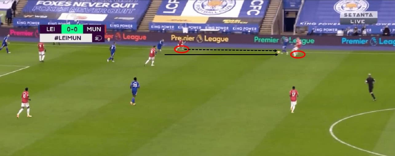 The first image above manifests how United restricted Leicester to access the centre. The striker Martial and non-ball-side winger Rashford stepped to match up with the centre-back-duo. All passing lanes to the centre was closed and no circulation between two centre-backs was allowed. The ball was forced to the flank.