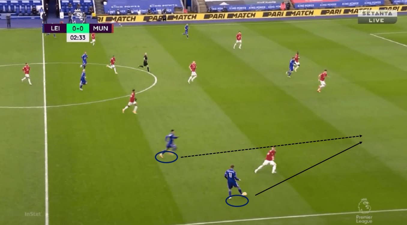You could see the example from the above image. Albrighton latched onto the ball in the middle third of the pitch while Justin did an underlapping run to create a 2v1 numeral superiority scenario. United’s left-back was overloaded and Justin received the pass from Albrighton and crossed early as soon as he could make contact on the ball.