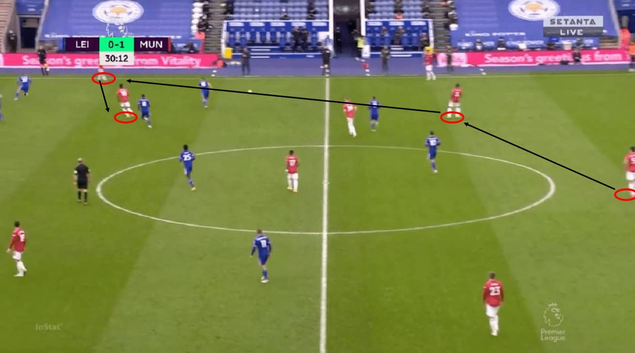 As we’ve mentioned above, Leicester have a top-class pivot in Tielemans. He is the key player in the squad and most of the tactics were built around him. When Leicester played out from the back, they would catch United’s mistakes of not controlling the centre-back-duo well and directly find Tielemans who could turn in the overloaded holding zone. This was the basic playing out to midfield model for Leicester. If Tielemans could not be picked vertically, a third-man would be employed to activate the status of Tielemans receiving the ball facing forwards.