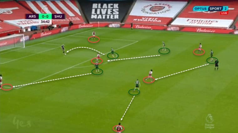 Again, this game showed Arteta’s prowess to read the game and make the necessary tweaks to break the opposite structure. The Blades need to improve the support given in their counter-attacks if they want to succeed in playing a transitional style. They should play a more positional style to progress through the thirds compactly and arrive at the final third with numerical superiority.