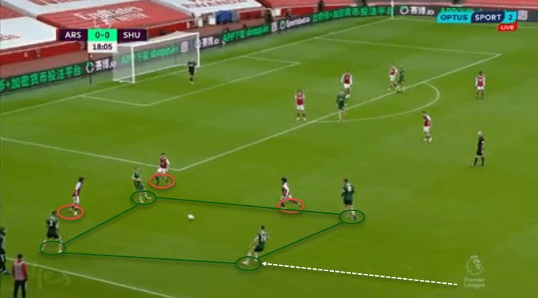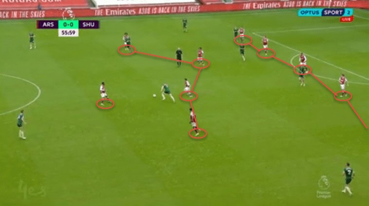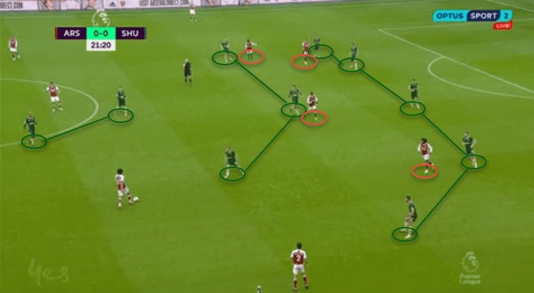 When out of possession, Arteta’s defensive tactics also reduced the Blades’ opportunities to score. When defending, they positioned in a low 5-3-1. Saka withdraws as a fifth defender, and Aubameyang and Willian sat back next to Ceballos and Elneny. Against this structure, we saw a lack of ideas to create any chances on goal. The Blades’ lack of movement off the ball and rotations made their attacks predictable, facilitating the Gunners’ job to defend organized.
