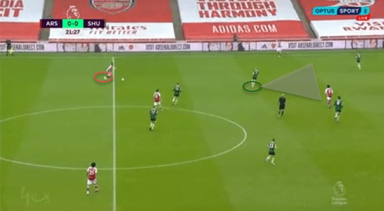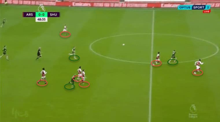 Few were the cases in which the Blades could keep the ball’s possession in the final third. When promoted to the Premier League, this team call attention with the back three’s involvement in the last third. We only saw a couple of opportunities in which this happened. The next picture depicts one occasion they created an overload in the flanks due to the wide-back participation in the final third. With Robinson and Chris Basham more focused on defensive duties, they were not involved in their attacking phase, reducing last season’s strengths. Considering the lack of defensive attributes of Gunners’ players used in the flanks, the Blades could have taken advantage of these attacks from the sides.