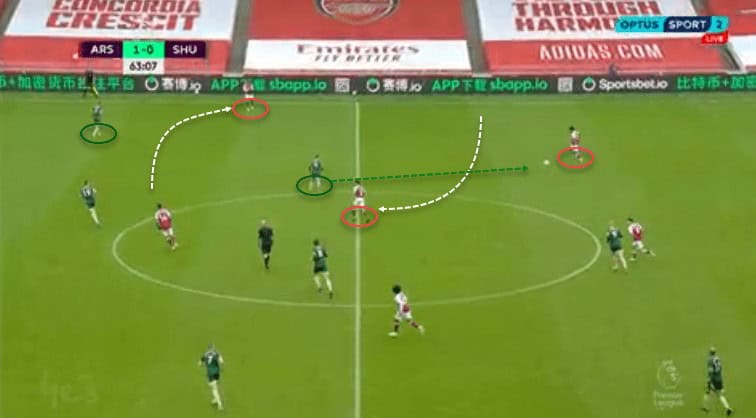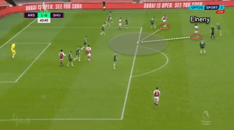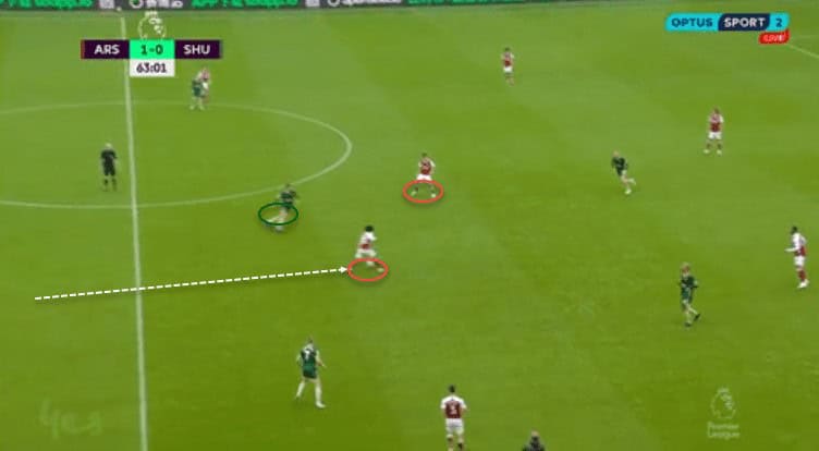 As we mentioned before, the Blades did not allow space between the lines due to their inside man-marking. The Gunners braked this structure with a shift in their attacking tactics. Elneny was for the first time involved in the attacking phase. He did a progressive run to collect the ball inside the defensive structure. He was unmarked and created the necessary chaos in the Blades block. The Gunners used a player whose role was covering in the rest-defense. The creativity in Arteta’s tactics in the second half gave them the first scoring opportunity, being ruthless to score on their first chance.