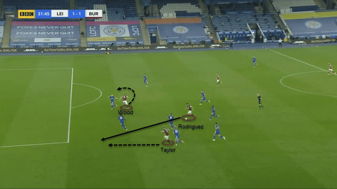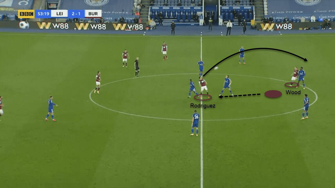 In the build-up phase, Burnley significantly preferred going long to their strikers. Either Rodriguez or Wood would flick the ball for the other.