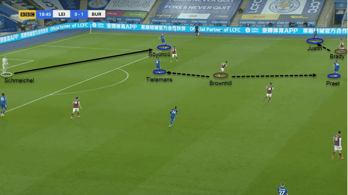Schmeichel’s pass to Söyüncü urged Brownhill to leave Tielemans and trackback and cover Praet. At the same time, Brady was approaching Justin and was aware of Praet’s positioning as he was unmarked.