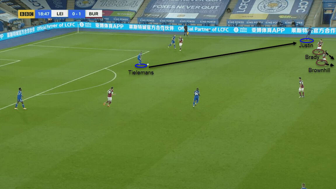 Söyüncü played a lateral pass to Tielemans instead of a forward pass as he was now left unmarked. Since Brady was double-minded and Brownhill was urgently tracking back, both the players ended up going for Praet leaving Justin open in the wide areas.