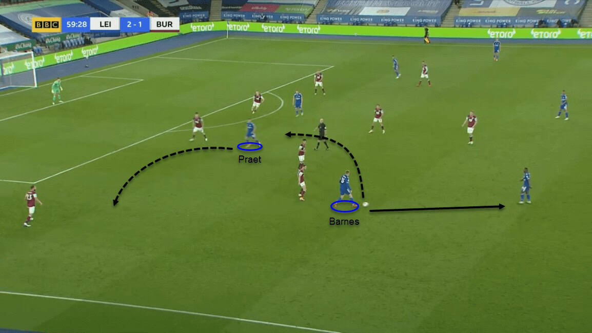 Praet was key in positional switches on both ends with Barnes and Pérez from time to time. Praet’s positioning out wide provisioned Pérez to run inside the box and receive a square pass from him. Hence it contributed to Pérez assisting Justin from a low cross in the box for the Foxes’ third goal.