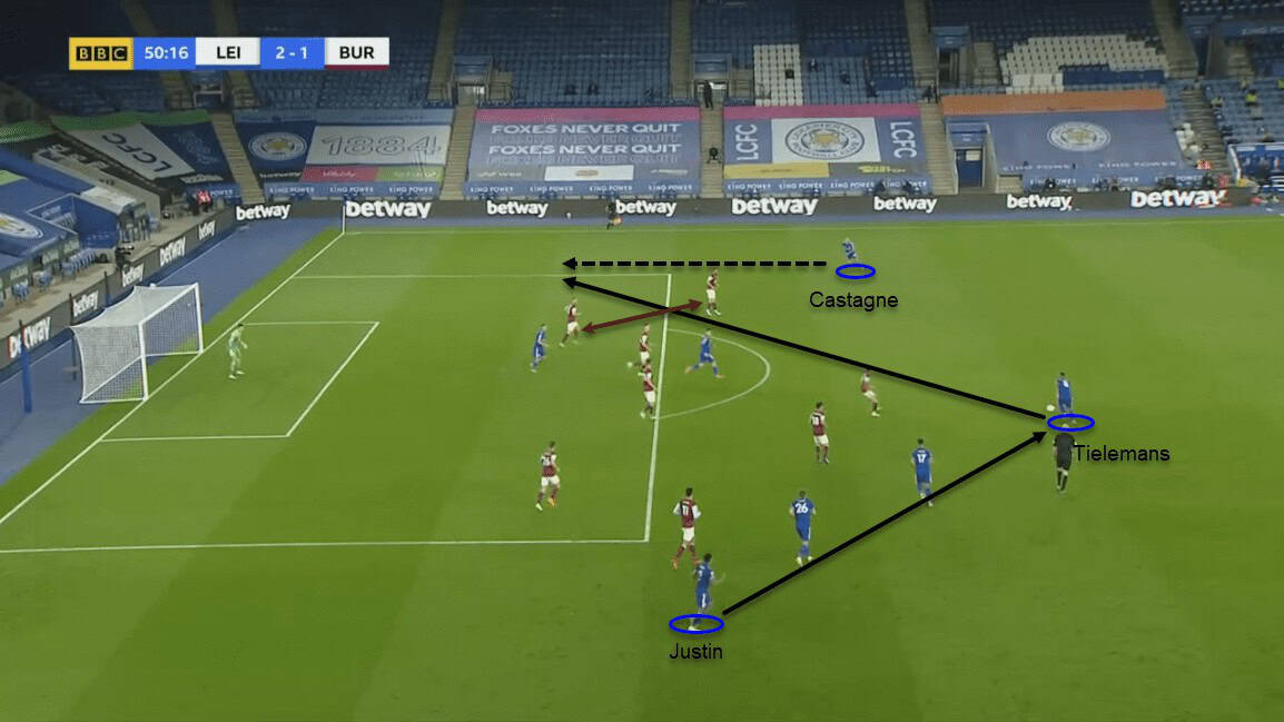 The pressure from Burnley would reduce once the ball entered the middle third. Justin and Castagne held the width of their team when in possession and allowed Barnes and Pérez to invert. Its salient purpose was to have multiple passing options for progression.