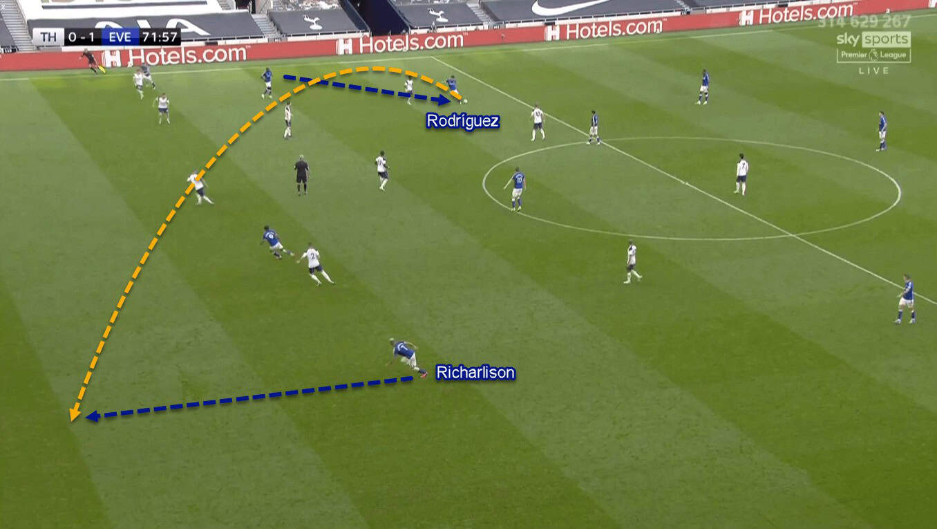 Despite the ‘conservative’ shape, Spurs defended quite actively when Everton tried to penetrate their block. That being their activeness to set up traps and cover the spaces cleverly whenever Everton tried to move through the thirds. There are differences, though, especially when the ball was played centrally and through the flanks.