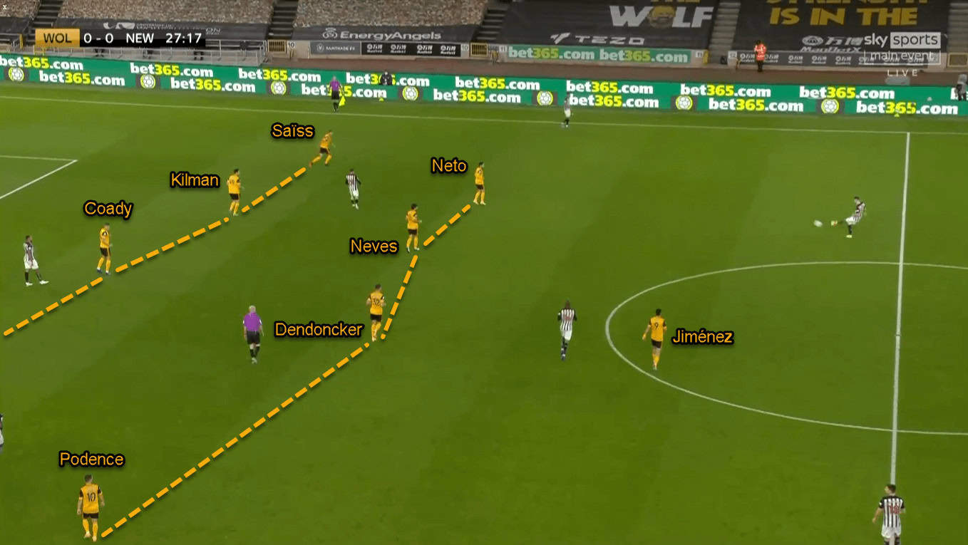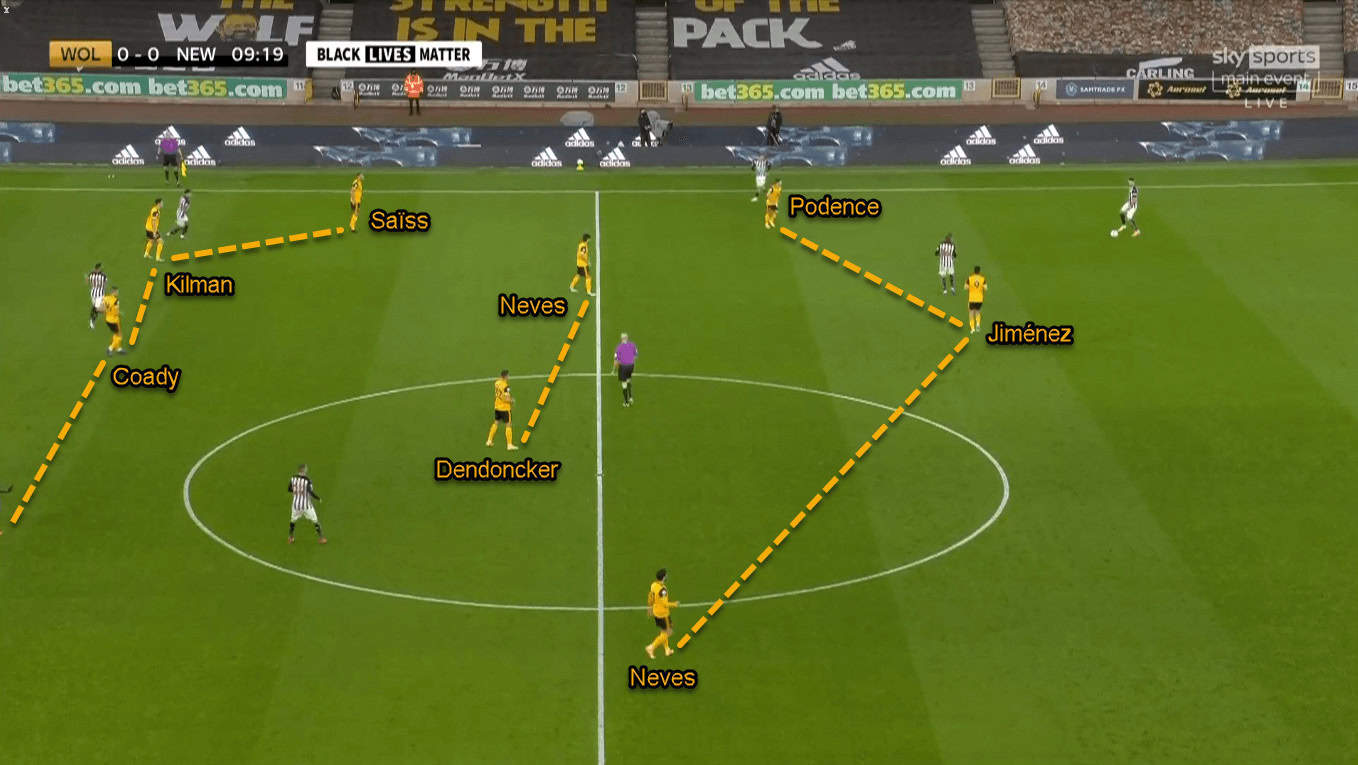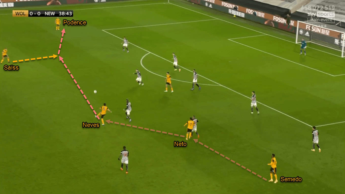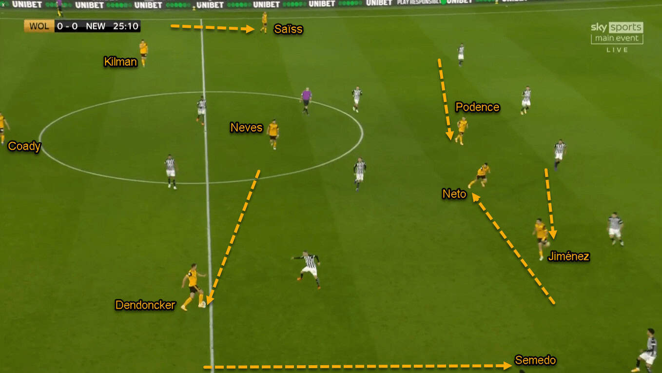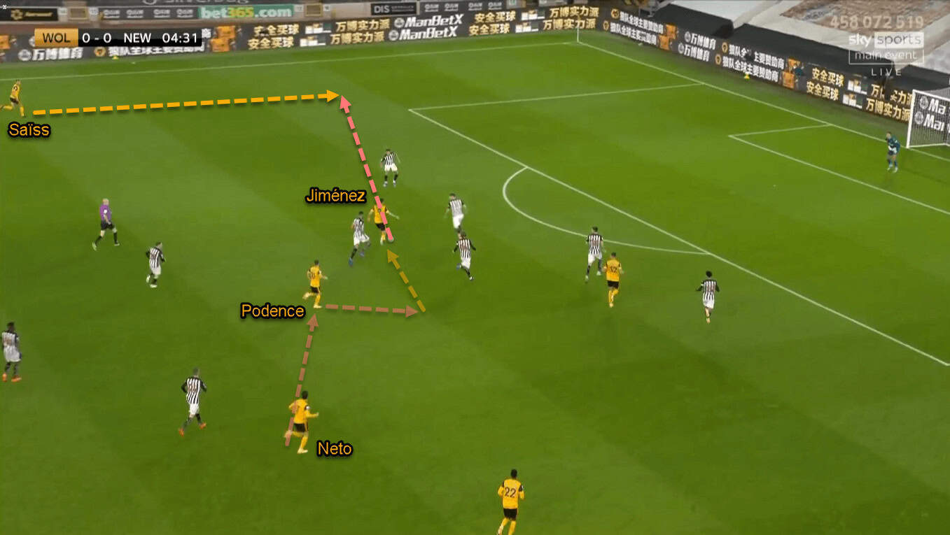 Another way Wolves used after playing in between the lines was to play the ball to the opposite flank via short combinations. In this flank-to-flank approach, the hosts tried to disrupt Newcastle’s defensive department by moving the ball quickly across the pitch, forcing the visitors to be hardly organised. After the ball reached the other flank, the flank player then was tasked to send crosses into the box to the attackers inside.
