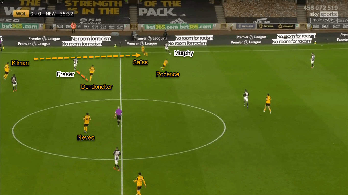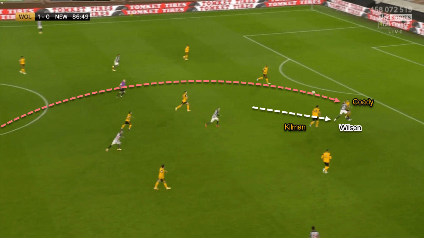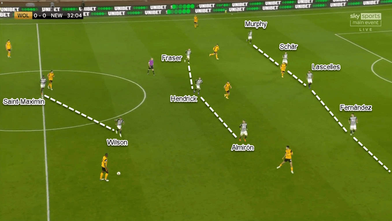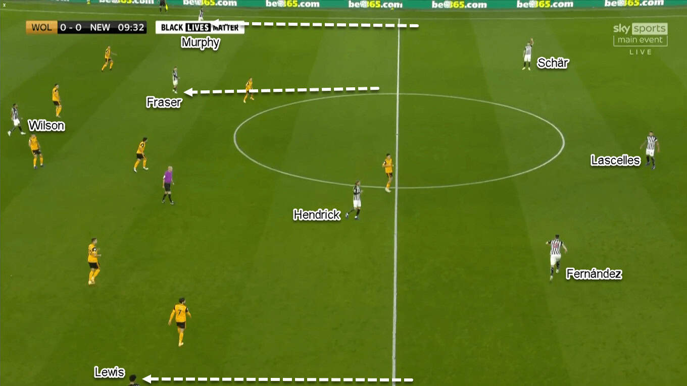 Despite the intricate movements, Newcastle’s biggest threats came from playing direct balls to Wilson. The main distributor in the first half was the right wing-back, Murphy. It’s no wonder why the majority (51.72%) of the visitors’ attacks came from his playing side. In the second half, Bruce gave the responsibility to Hendrick. This was partly because Wolves didn’t give much pressure on him when he got the ball.