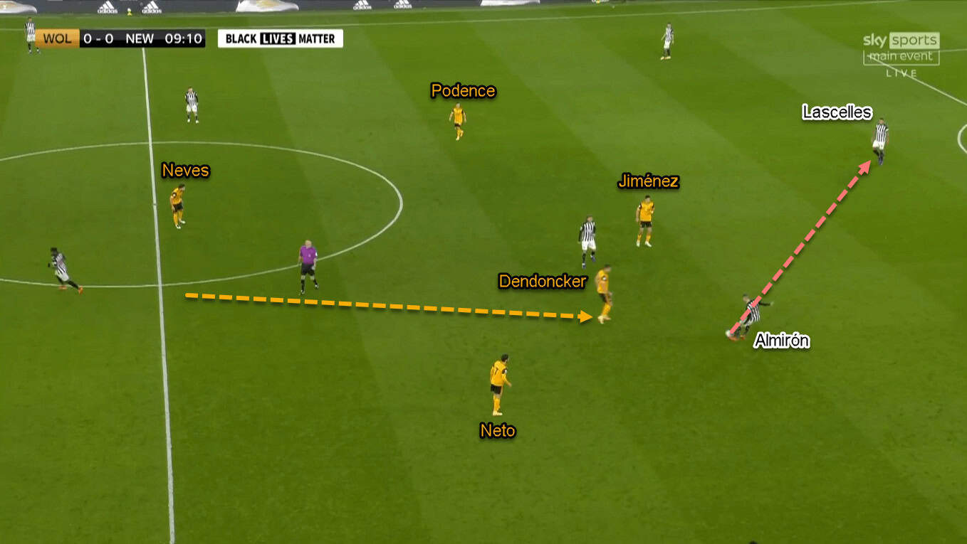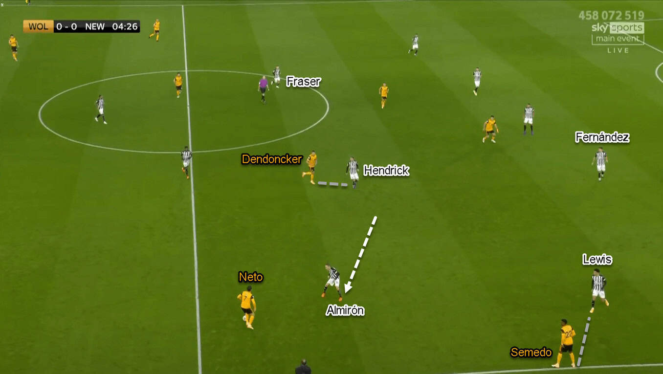 If Newcastle tried to penetrate centrally, the nearest Wolves central midfielder would press his counterpart even before the Newcastle midfielder received the ball. In the process, either Rúben Neves or Dendoncker would leave his initial area up to the attacking line to quickly press Fraser or Almirón, while his partner stayed put. This is why both Fraser and Almirón made so many backwards passes: 19 to be exact.