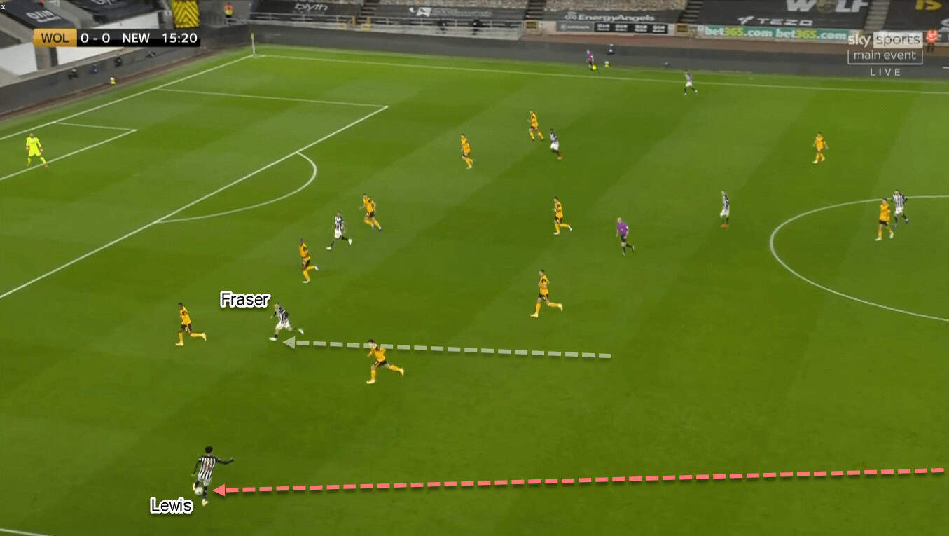 Wolves’ calculated defending in the middle prohibited Newcastle to penetrate centrally. To counter that, they would try to build their attacks near the touchline. Usually, Bruce would ask his ball-side central midfielder to drift wide and connect with the marauding wing-back easier. It’s not just that, though – both Fraser and Almirón were also given the task to overload the flank in the final third if necessary. It’s safe to say that Newcastle almost completely abandoned the central lanes when attacking.