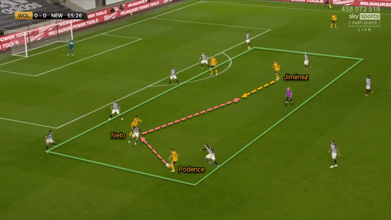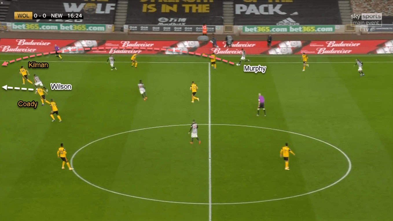 We already know that Newcastle would force Wolves to play through the flanks. But what did they do to contain the hosts there? There were two main options that the visitors used in this match, as follows:
