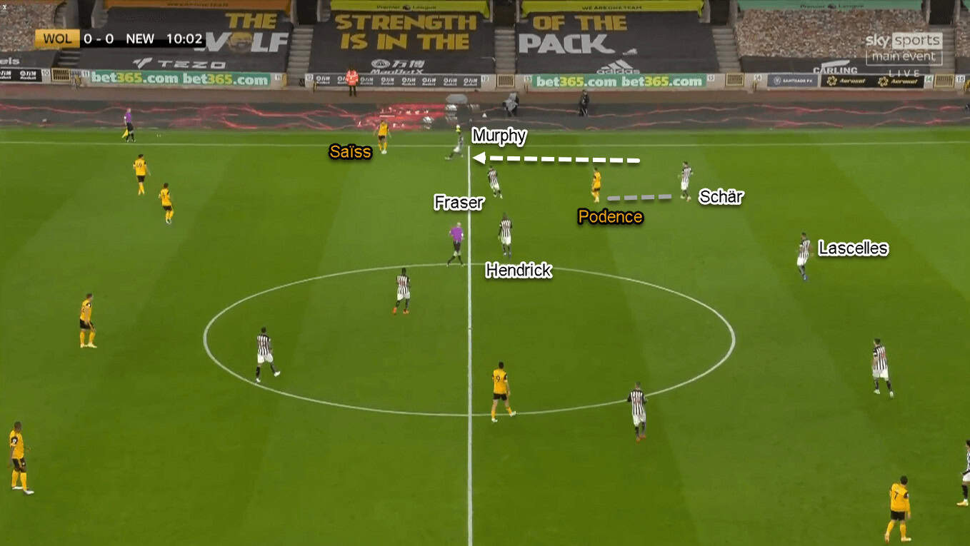 First, by instructing the ball-side wing-back to come up from the backline and press the opponents’ flank player. This mostly happened in Newcastle’s right side, with Jacob Murphy pressing on Saïss because the latter wasn’t too aggressive in his positioning. Inside, Bruce asked the nearby central midfielder and/or centre-back to close the progressive passing option(s) for the Moroccan. In that way, Wolves were prohibited to penetrate through the defensive block easily.