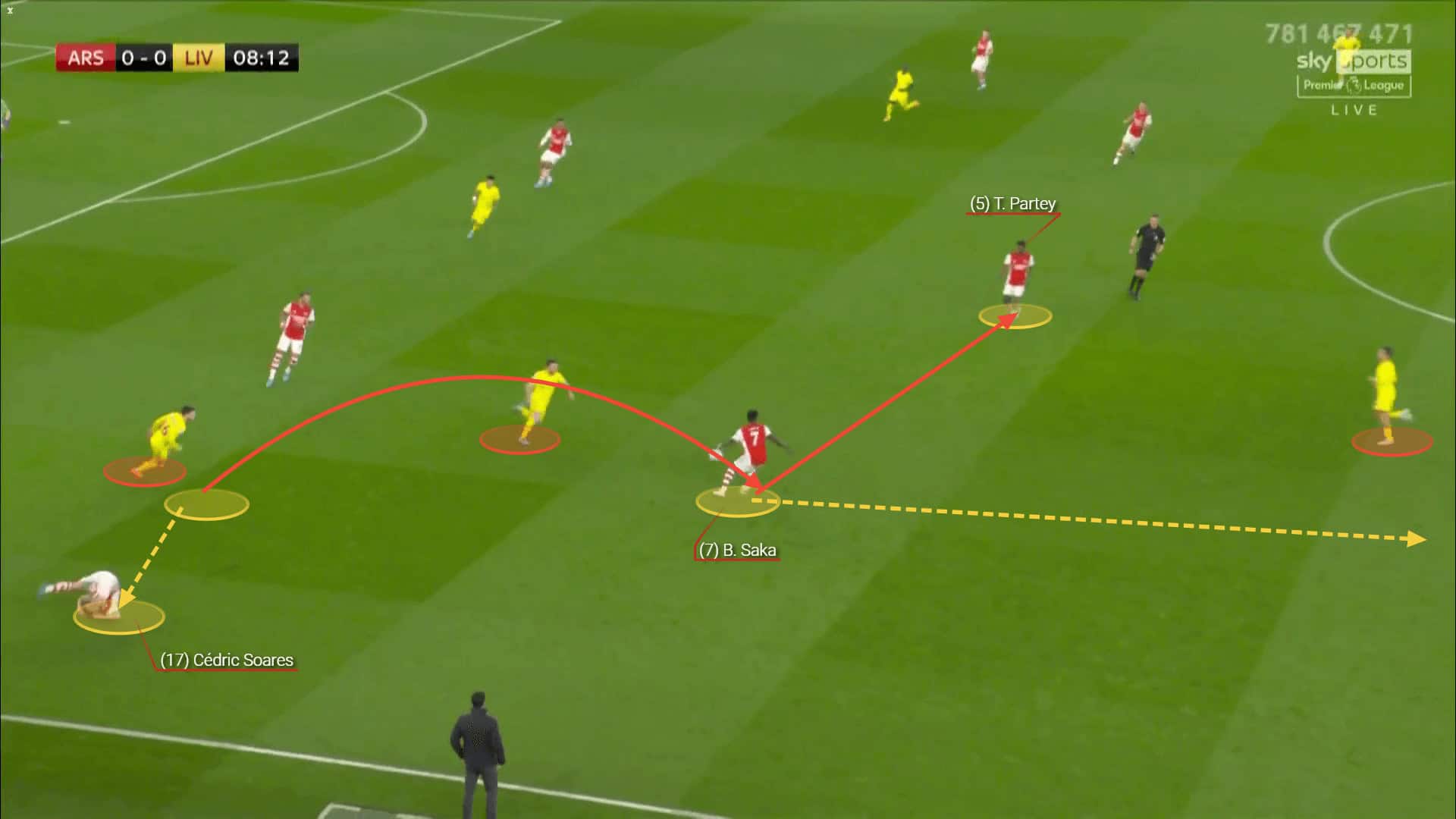 Partey’s composure then helped him to escape the pressure and send a smart long ball to Saka on the flank and dismiss Liverpool’s second line of defence. This is a showcase of Arsenal’s improved actions in possession as they managed to escape the overloaded midfield area with a couple of quick passes. It also shows Partey’s importance in ball progression.One of the most criticised Arsenal players, Xhaka, was brought to new life under Arteta and has now become one of the pivots of this team. His increased defensive awareness, combined with his willingness to push the ball forward have affected the team’s performance in possession. Partey’s presence in midfield has underlined how desperately the team needed a strong central pair to improve the connection between the lines. The former Atletico Madrid player is vital for breaking their opponents’ ball progression efforts, while his passing abilities have proven crucial for the team’s final third distribution.