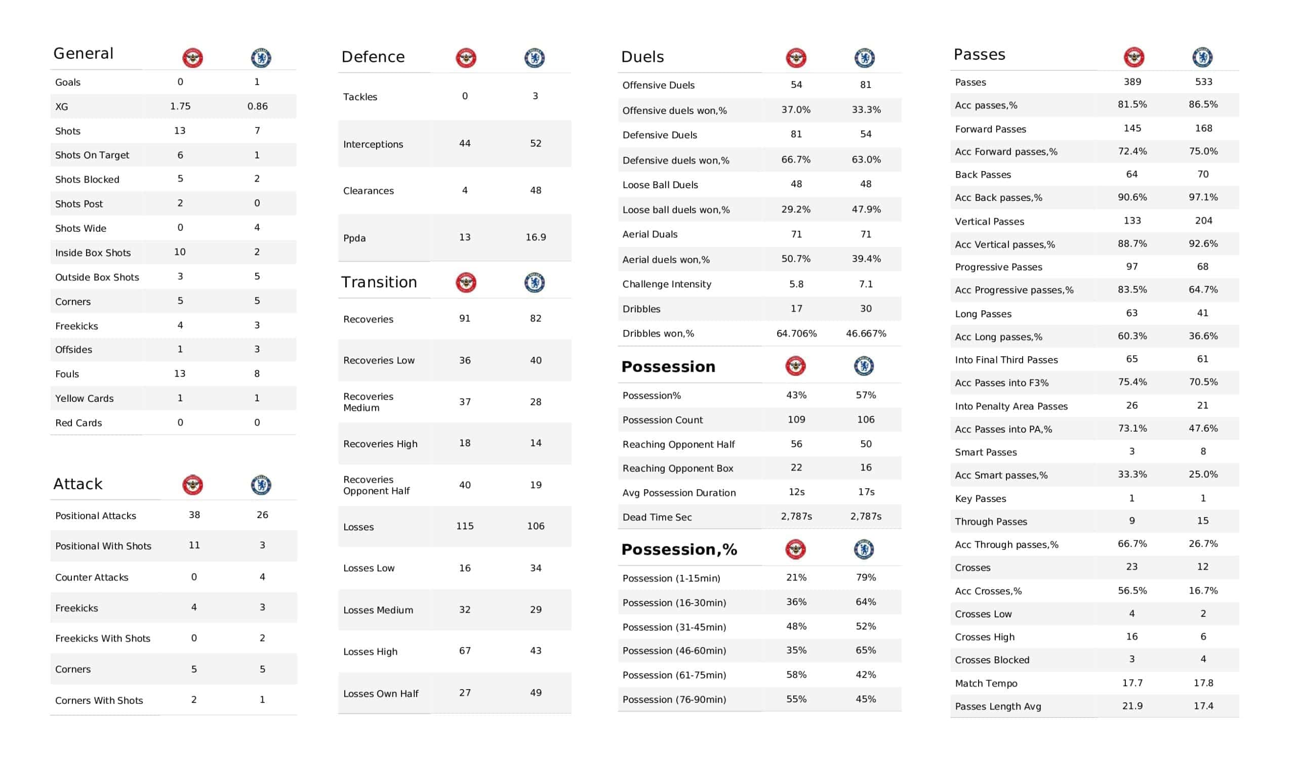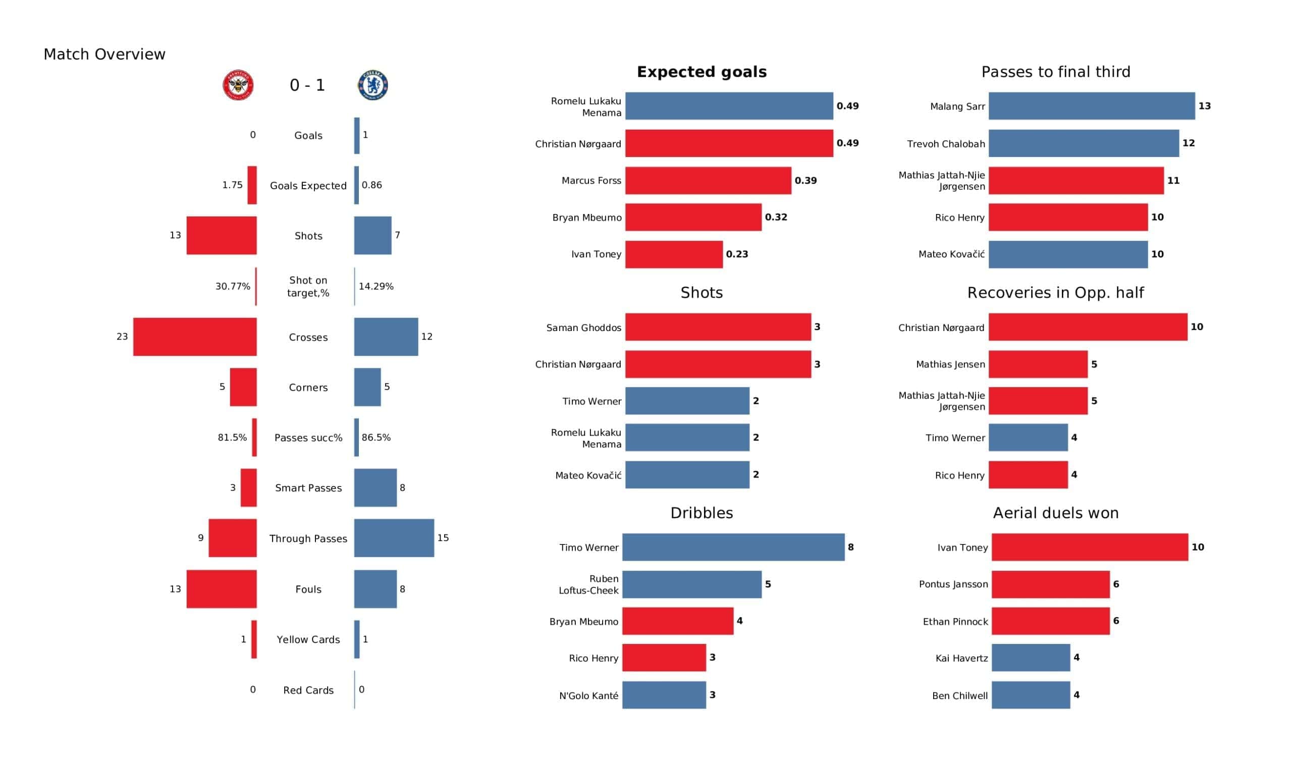 <a href="https://totalfootballanalysis.com/match-analysis/premier-league-2021-22-brentford-vs-liverpool-stats">Brentford</a> and <a href="https://totalfootballanalysis.com/match-analysis/champions-league-2021-22-juventus-vs-chelsea-tactical-analysis">Chelsea</a> ended Saturday's <a href="https://totalfootballanalysis.com/match-analysis/premier-league-2021-22-southampton-vs-leeds-post-match-data-viz-and-stats">Premier League</a> action in a thrilling match resulting in a 1-0 win for Thomas Tuchel's side. We've broken down all the key <a href="https://totalfootballanalysis.com/opinion/tomiyasus-stats-already-show-he-will-play-an-important-role-for-arsenal">stats</a> for you to digest in this tactical analysis, including; * shot maps * xT (expected threat) * pass networks * xG timelines * defensive duels * average positions and much more! We also try to answer some questions for you with the visuals; Who had the higher xG? Which team had more possession? Which team had the higher xT? To navigate the stats gallery simply click on the numbers to move through the pages. <em><strong>Don't forget, if you take out a <a href="https://totalfootballanalysis.com/subscribe">free membership</a> to Total Football Analysis, you can receive our weekly Premier League Analytics Pack free of charge which includes all the analytics from every match, team benchmarking tables and player benchmarking tables - well over 150 pages of information after every matchweek is complete!</strong></em> <a href="https://totalfootballanalysis.com/wp-content/uploads/2021/10/Brentford-vs-Chelsea_page-0001-scaled.jpg"><img class="aligncenter size-full wp-image-180592" src="https://totalfootballanalysis.com/wp-content/uploads/2021/10/Brentford-vs-Chelsea_page-0001-scaled.jpg" alt="Premier League 2021/22: Brentford vs Chelsea - post-match data viz and stats" width="2560" height="1504" /></a><!--nextpage--> <a href="https://totalfootballanalysis.com/wp-content/uploads/2021/10/Brentford-vs-Chelsea_page-0002-scaled.jpg"><img class="aligncenter size-full wp-image-180594" src="https://totalfootballanalysis.com/wp-content/uploads/2021/10/Brentford-vs-Chelsea_page-0002-scaled.jpg" alt="Premier League 2021/22: Brentford vs Chelsea - post-match data viz and stats" width="2560" height="1504" /></a> <a href="https://totalfootballanalysis.com/wp-content/uploads/2021/10/Brentford-vs-Chelsea_page-0003-scaled.jpg"><img class="aligncenter size-full wp-image-180596" src="https://totalfootballanalysis.com/wp-content/uploads/2021/10/Brentford-vs-Chelsea_page-0003-scaled.jpg" alt="Premier League 2021/22: Brentford vs Chelsea - post-match data viz and stats" width="2560" height="1504" /></a> <a href="https://totalfootballanalysis.com/wp-content/uploads/2021/10/Brentford-vs-Chelsea_page-0004-scaled.jpg"><img class="aligncenter size-full wp-image-180597" src="https://totalfootballanalysis.com/wp-content/uploads/2021/10/Brentford-vs-Chelsea_page-0004-scaled.jpg" alt="Premier League 2021/22: Brentford vs Chelsea - post-match data viz and stats" width="2560" height="1504" /></a> <a href="https://totalfootballanalysis.com/wp-content/uploads/2021/10/Brentford-vs-Chelsea_page-0005-scaled.jpg"><img class="aligncenter size-full wp-image-180599" src="https://totalfootballanalysis.com/wp-content/uploads/2021/10/Brentford-vs-Chelsea_page-0005-scaled.jpg" alt="Premier League 2021/22: Brentford vs Chelsea - post-match data viz and stats" width="2560" height="1504" /></a> <!--nextpage--> <a href="https://totalfootballanalysis.com/wp-content/uploads/2021/10/Brentford-vs-Chelsea_page-0006-scaled.jpg"><img class="aligncenter size-full wp-image-180601" src="https://totalfootballanalysis.com/wp-content/uploads/2021/10/Brentford-vs-Chelsea_page-0006-scaled.jpg" alt="Premier League 2021/22: Brentford vs Chelsea - post-match data viz and stats" width="2560" height="1504" /></a> <a href="https://totalfootballanalysis.com/wp-content/uploads/2021/10/Brentford-vs-Chelsea_page-0007-scaled.jpg"><img class="aligncenter size-full wp-image-180602" src="https://totalfootballanalysis.com/wp-content/uploads/2021/10/Brentford-vs-Chelsea_page-0007-scaled.jpg" alt="Premier League 2021/22: Brentford vs Chelsea - post-match data viz and stats" width="2560" height="1504" /></a> <a href="https://totalfootballanalysis.com/wp-content/uploads/2021/10/Brentford-vs-Chelsea_page-0008-scaled.jpg"><img class="aligncenter size-full wp-image-180603" src="https://totalfootballanalysis.com/wp-content/uploads/2021/10/Brentford-vs-Chelsea_page-0008-scaled.jpg" alt="Premier League 2021/22: Brentford vs Chelsea - post-match data viz and stats" width="2560" height="1504" /></a> <a href="https://totalfootballanalysis.com/wp-content/uploads/2021/10/Brentford-vs-Chelsea_page-0009-scaled.jpg"><img class="aligncenter size-full wp-image-180604" src="https://totalfootballanalysis.com/wp-content/uploads/2021/10/Brentford-vs-Chelsea_page-0009-scaled.jpg" alt="Premier League 2021/22: Brentford vs Chelsea - post-match data viz and stats" width="2560" height="1504" /></a><!--nextpage--> <a href="https://totalfootballanalysis.com/wp-content/uploads/2021/10/Brentford-vs-Chelsea_page-0010-scaled.jpg"><img class="aligncenter size-full wp-image-180605" src="https://totalfootballanalysis.com/wp-content/uploads/2021/10/Brentford-vs-Chelsea_page-0010-scaled.jpg" alt="Premier League 2021/22: Brentford vs Chelsea - post-match data viz and stats" width="2560" height="1504" /></a> <a href="https://totalfootballanalysis.com/wp-content/uploads/2021/10/Brentford-vs-Chelsea_page-0011-scaled.jpg"><img class="aligncenter size-full wp-image-180606" src="https://totalfootballanalysis.com/wp-content/uploads/2021/10/Brentford-vs-Chelsea_page-0011-scaled.jpg" alt="Premier League 2021/22: Brentford vs Chelsea - post-match data viz and stats" width="2560" height="1504" /></a> <a href="https://totalfootballanalysis.com/wp-content/uploads/2021/10/Brentford-vs-Chelsea_page-0012-scaled.jpg"><img class="aligncenter size-full wp-image-180607" src="htt