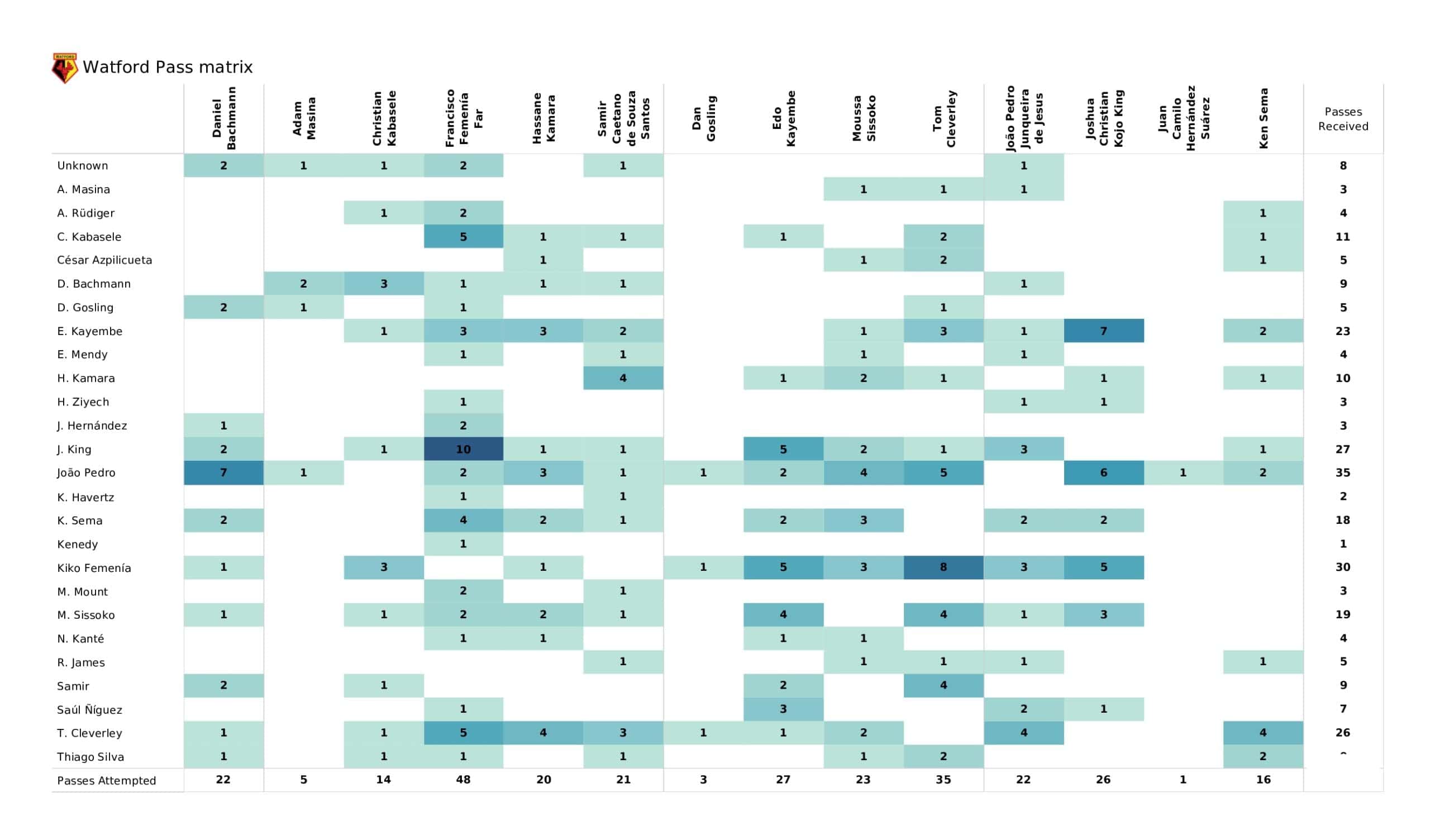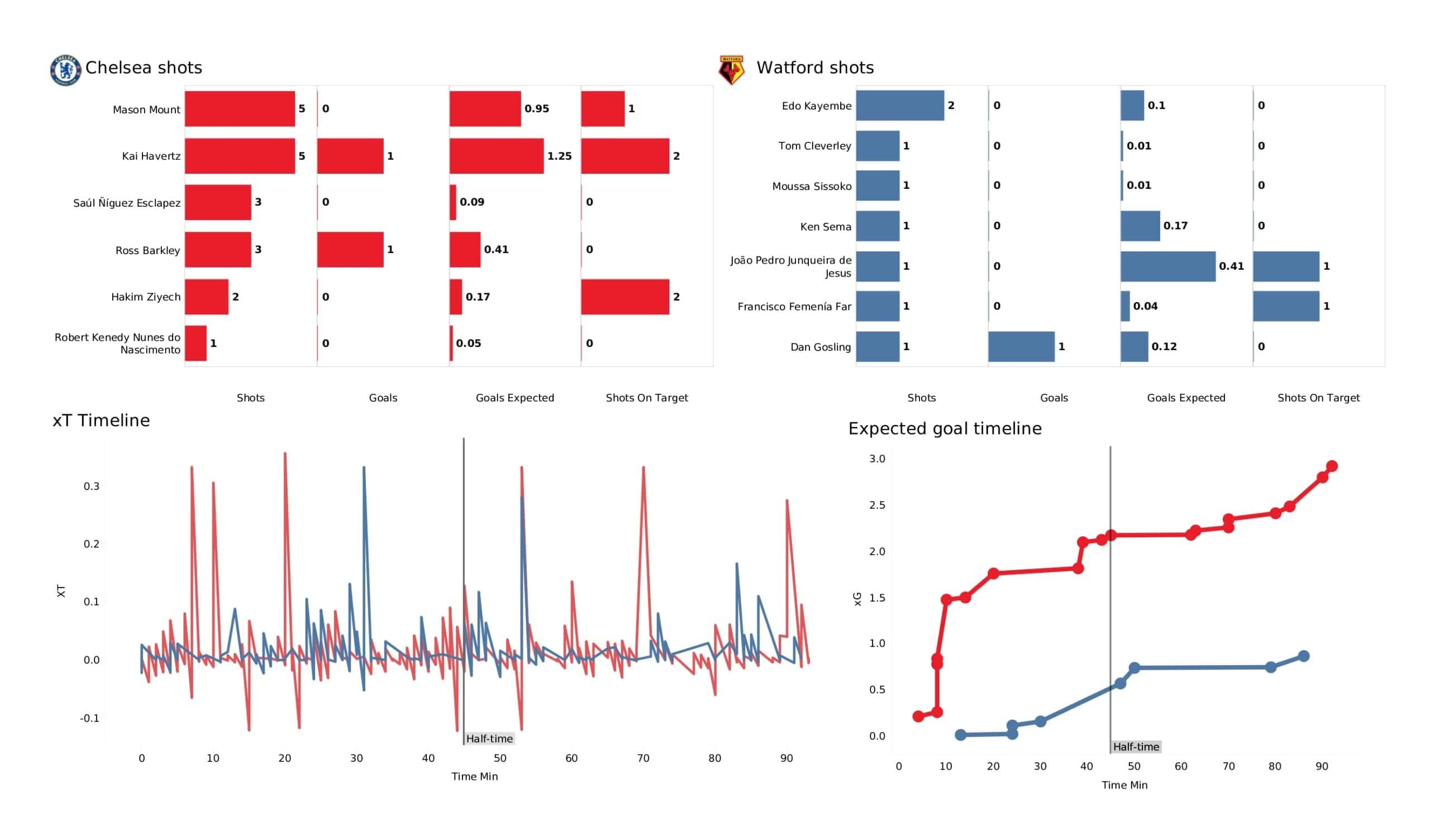 Sunday evening saw <a href="https://totalfootballanalysis.com/match-analysis/premier-league-2021-22-chelsea-vs-leicester-city-data-viz-stats-and-insights">Chelsea </a>beat <a href="https://totalfootballanalysis.com/match-analysis/premier-league-2021-22-watford-vs-leicester-data-viz-stats-and-insights">Watford</a> 2-1 with the help of a late winner by Ross Barkley in the <a href="https://totalfootballanalysis.com/match-analysis/free-download-premier-league-gw8-analytics-reports-data-viz-and-stats">Premier League</a>. We've broken down all the key <a href="https://totalfootballanalysis.com/match-analysis/free-download-premier-league-gw8-analytics-reports-data-viz-and-stats">stats</a> for you to digest in this tactical analysis and provide <a href="https://totalfootballanalysis.com/player-analysis/but-what-does-that-visual-actually-tell-us">insights</a> around; * shot maps and set-pieces * xT (expected threat) * pass networks * xG timelines * defensive duels * average positions and much more! We also try to answer some questions for you with the visuals; Who was Chelsea's biggest threat? Who made the most recoveries in the opposition half? Who had the highest xG in the match? To navigate the stats gallery simply click on the numbers to move through the pages. <em><strong>Don't forget, if you take out a free <a href="https://totalfootballanalysis.com/subscribe">membership</a> to Total Football Analysis, you can receive our weekly Premier League Analytics Pack free of charge which includes all the analytics from every match, team benchmarking tables and player benchmarking tables - well over 150 pages of information after every matchweek is complete!</strong></em> <h2><em>Lineups and average positions</em></h2> <a href="https://totalfootballanalysis.com/wp-content/uploads/2022/05/Chelsea-vs-Watford_page-0002-scaled.jpg"><img class="alignnone size-full wp-image-317933" src="https://totalfootballanalysis.com/wp-content/uploads/2022/05/Chelsea-vs-Watford_page-0002-scaled.jpg" alt="Premier League 2021/22: Chelsea vs Watford - data viz, stats and insights" width="2560" height="1504" /></a> <a href="https://totalfootballanalysis.com/wp-content/uploads/2022/05/Chelsea-vs-Watford_page-0003-scaled.jpg"><img class="alignnone size-full wp-image-317934" src="https://totalfootballanalysis.com/wp-content/uploads/2022/05/Chelsea-vs-Watford_page-0003-scaled.jpg" alt="Premier League 2021/22: Chelsea vs Watford - data viz, stats and insights" width="2560" height="1504" /></a> <a href="https://totalfootballanalysis.com/wp-content/uploads/2022/05/Chelsea-vs-Watford_page-0004-scaled.jpg"><img class="alignnone size-full wp-image-317935" src="https://totalfootballanalysis.com/wp-content/uploads/2022/05/Chelsea-vs-Watford_page-0004-scaled.jpg" alt="Premier League 2021/22: Chelsea vs Watford - data viz, stats and insights" width="2560" height="1504" /></a> <a href="https://totalfootballanalysis.com/wp-content/uploads/2022/05/Chelsea-vs-Watford_page-0005-scaled.jpg"><img class="alignnone size-full wp-image-317936" src="https://totalfootballanalysis.com/wp-content/uploads/2022/05/Chelsea-vs-Watford_page-0005-scaled.jpg" alt="Premier League 2021/22: Chelsea vs Watford - data viz, stats and insights" width="2560" height="1504" /></a><!--nextpage--> <h2><em>Stats and shot maps </em></h2> <a href="https://totalfootballanalysis.com/wp-content/uploads/2022/05/Chelsea-vs-Watford_page-0006-scaled.jpg"><img class="alignnone size-full wp-image-317937" src="https://totalfootballanalysis.com/wp-content/uploads/2022/05/Chelsea-vs-Watford_page-0006-scaled.jpg" alt="Premier League 2021/22: Chelsea vs Watford - data viz, stats and insights" width="2560" height="1504" /></a> <a href="https://totalfootballanalysis.com/wp-content/uploads/2022/05/Chelsea-vs-Watford_page-0007-scaled.jpg"><img class="alignnone size-full wp-image-317938" src="https://totalfootballanalysis.com/wp-content/uploads/2022/05/Chelsea-vs-Watford_page-0007-scaled.jpg" alt="Premier League 2021/22: Chelsea vs Watford - data viz, stats and insights" width="2560" height="1504" /></a> <a href="https://totalfootballanalysis.com/wp-content/uploads/2022/05/Chelsea-vs-Watford_page-0008-scaled.jpg"><img class="alignnone size-full wp-image-317939" src="https://totalfootballanalysis.com/wp-content/uploads/2022/05/Chelsea-vs-Watford_page-0008-scaled.jpg" alt="Premier League 2021/22: Chelsea vs Watford - data viz, stats and insights" width="2560" height="1504" /></a> <a href="https://totalfootballanalysis.com/wp-content/uploads/2022/05/Chelsea-vs-Watford_page-0009-scaled.jpg"><img class="alignnone size-full wp-image-317940" src="https://totalfootballanalysis.com/wp-content/uploads/2022/05/Chelsea-vs-Watford_page-0009-scaled.jpg" alt="Premier League 2021/22: Chelsea vs Watford - data viz, stats and insights" width="2560" height="1504" /></a><!--nextpage--> <h2><em>xT and xG timelines plus pass matrixes</em></h2> <a href="https://totalfootballanalysis.com/wp-content/uploads/2022/05/Chelsea-vs-Watford_page-0010-scaled.jpg"><img class="alignnone size-full wp-image-317941" src="https://totalfootballanalysis.com/wp-content/uploads/2022/05/Chelsea-vs-Watford_page-0010-scaled.jpg" alt="Premier League 2021/22: Chelsea vs Watford - data viz, stats and insights" width="2560" height="1504" /></a> <a href="https://totalfootballanalysis.com/wp-content/uploads/2022/05/Chelsea-vs-Watford_page-0011-scaled.jpg"><img class="alignnone size-full wp-image-317942" src="https://totalfootballanalysis.com/wp-content/uploads/2022/05/Chelsea-vs-Watford_page-0011-scaled.jpg" alt="Premier League 2021/22: Chelsea vs Watford - data viz, stats and insights" width="2560" height="1504" /></a> <a href="https://totalfootballanalysis.com/wp-content/uploads/2022/05/Chelsea-vs-Watford_page-0012-scaled.jpg"><img class="alignnone size-full wp-image-317943" src="https://totalfootballanalysis.com/wp-content/uploads/2022/05/Chelsea-vs-Watford_page-0012-scaled.jpg" alt="Premier League 2021/22: Chelsea vs Watford - data viz, s