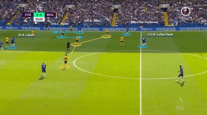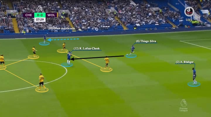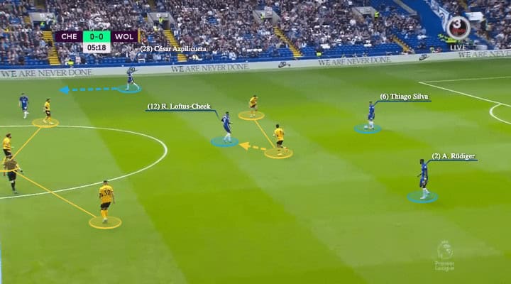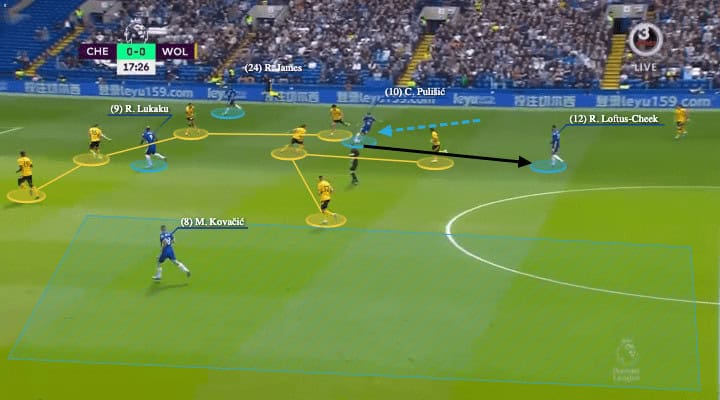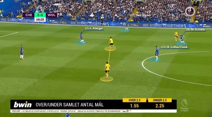 So you could see the passing sequence of Chelsea as shown in the above screenshot. When Loftus-Cheek received, he knew the other side was opened up and Antonio Rüdiger moved up to receive the short pass. Wolves were unable to catch the German international.