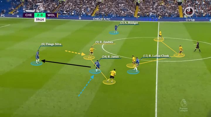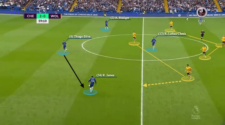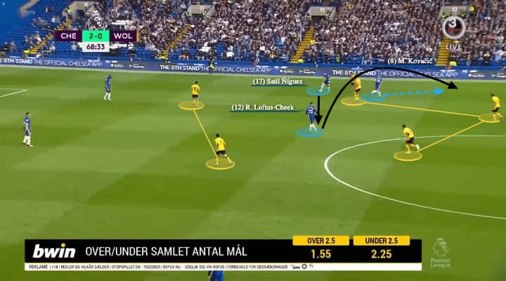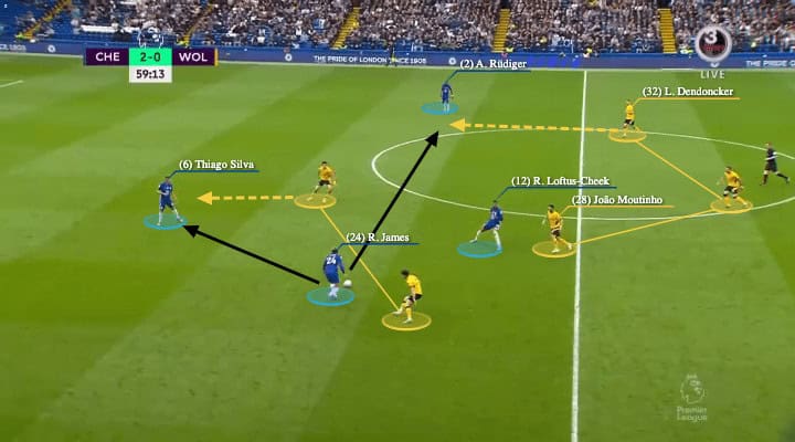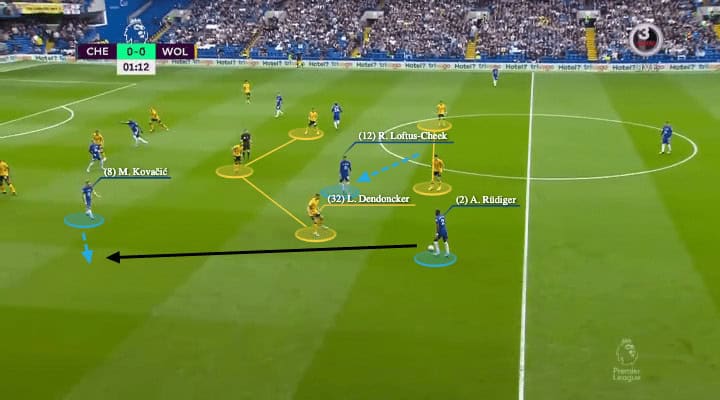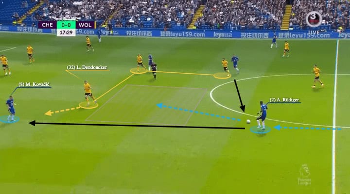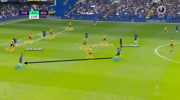 Meanwhile, Rüdiger, as the left side defender, he should always provoke a decisional dilemma on the Wolves 8 using that 3v2 (or 4v2) overload in the first line, carrying the ball forward to take Dendoncoker out of position, and having the courage to break lines to find Kovačić as shown above.